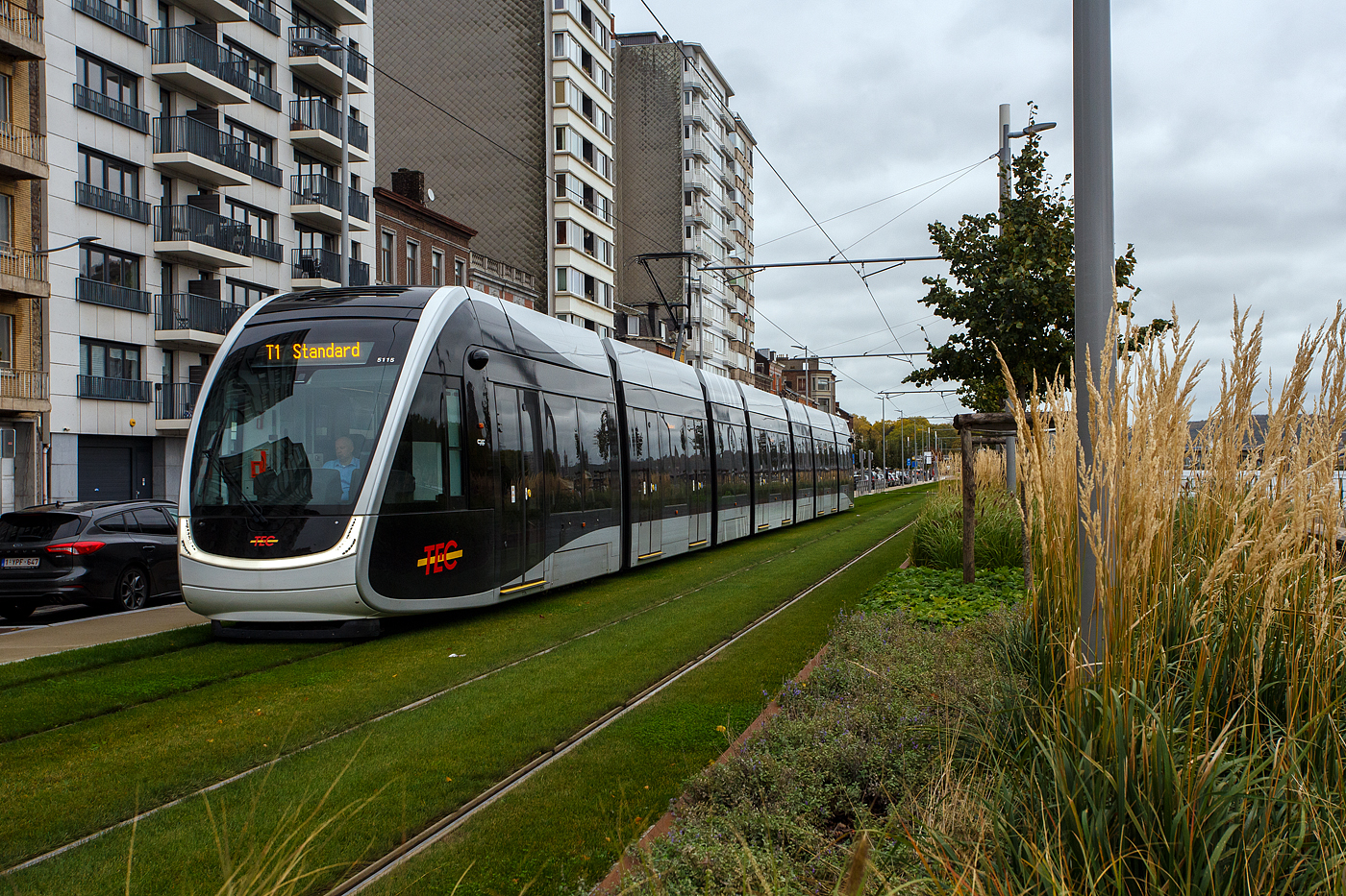 Die Tram entweder von der Haltestelle Liège Expo oder Place Coronmeuse, biegen hier an der Haltestelle Pont Maghin, in die Stadt ab und fährt hier das Eingleisige Teilstück bis zur Place Saint Lambert ab, dabei bedient er die Haltestelle Féronstrée. Aufgenommen vom Schiff bei der Rückfahrt nach Maastricht. 18.09.2025