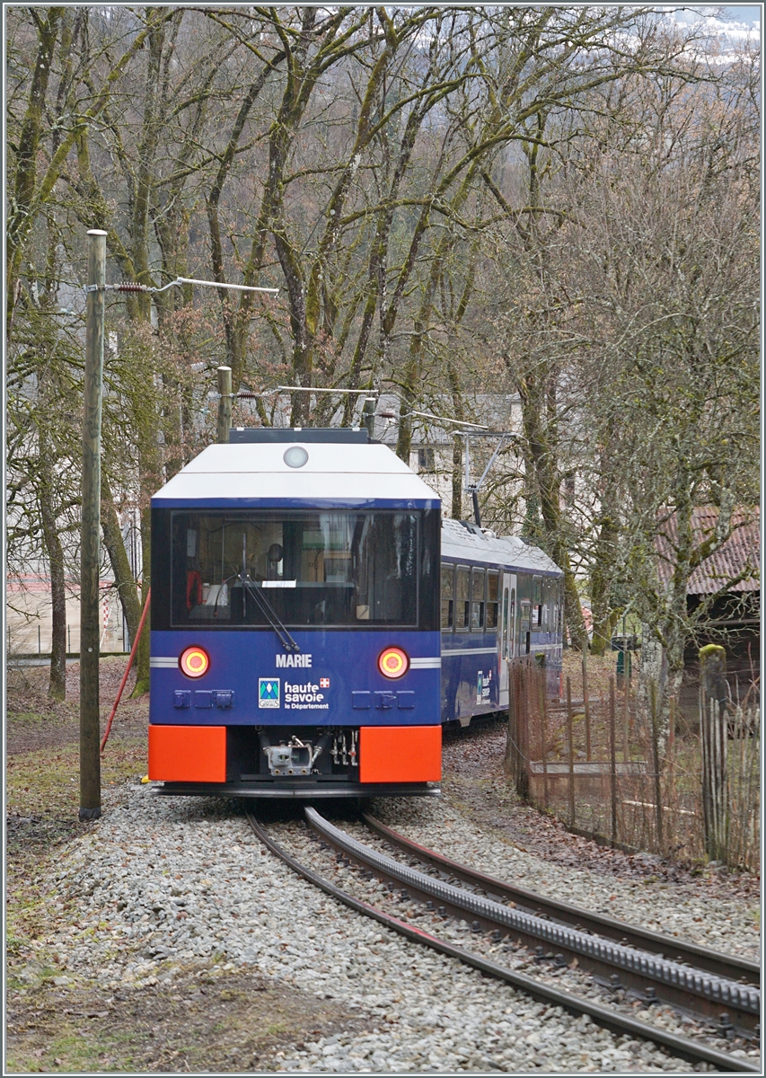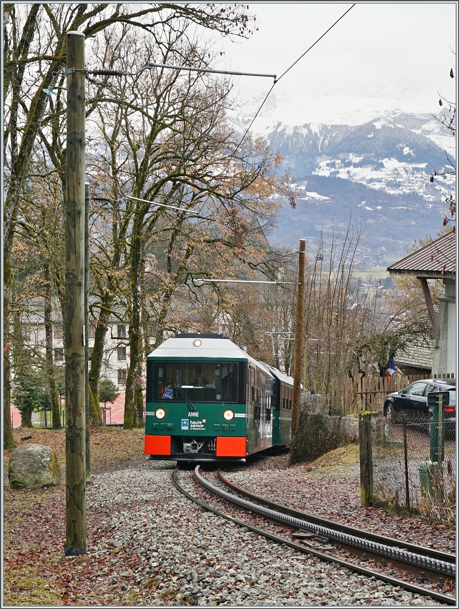 Im Bild der vom Col de Voza im TMB Bahnhof Le Fayet ankommende grüne Zug ANNE, bestehend aus dem Triebwagen ANNE und dem gleichnamigen Steuerwagen ANNE.