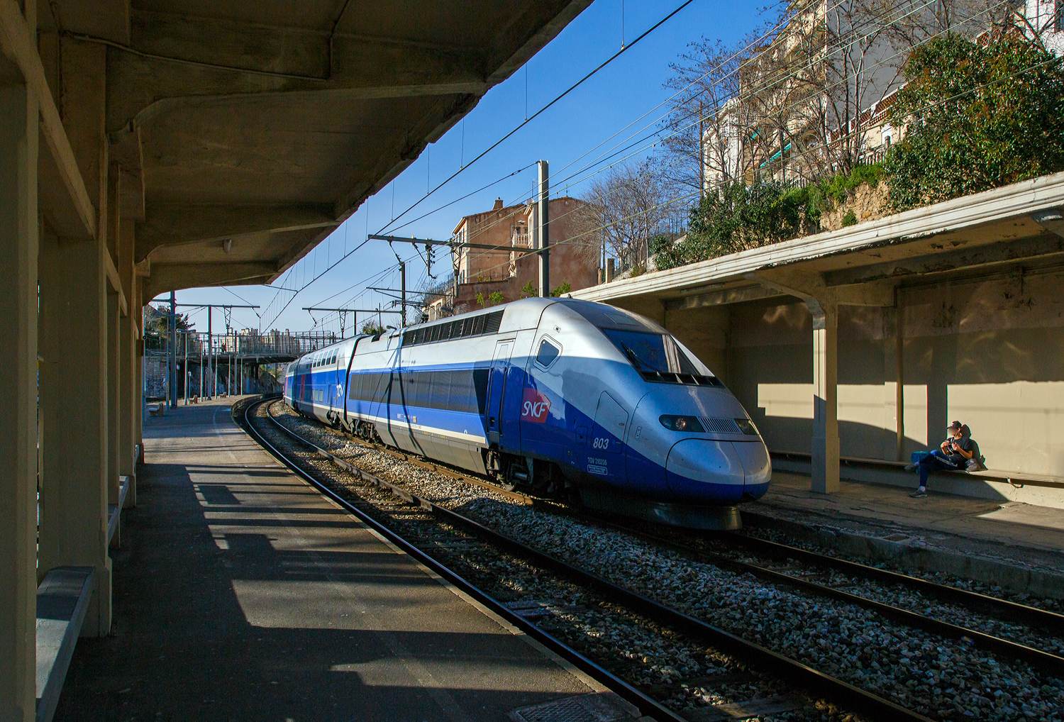 Man meint fast, dem TGV Rame 4722 anzusehen, wie er schwitzt, als er nach dem Halt in Bellegarde-sur-Valserine in dem kurvenreichen und in der Steigung befindlichen Bahnhof als TGV Lyria 9768 Bellegarde-sur-Valserine in Richtung Paris verlässt.