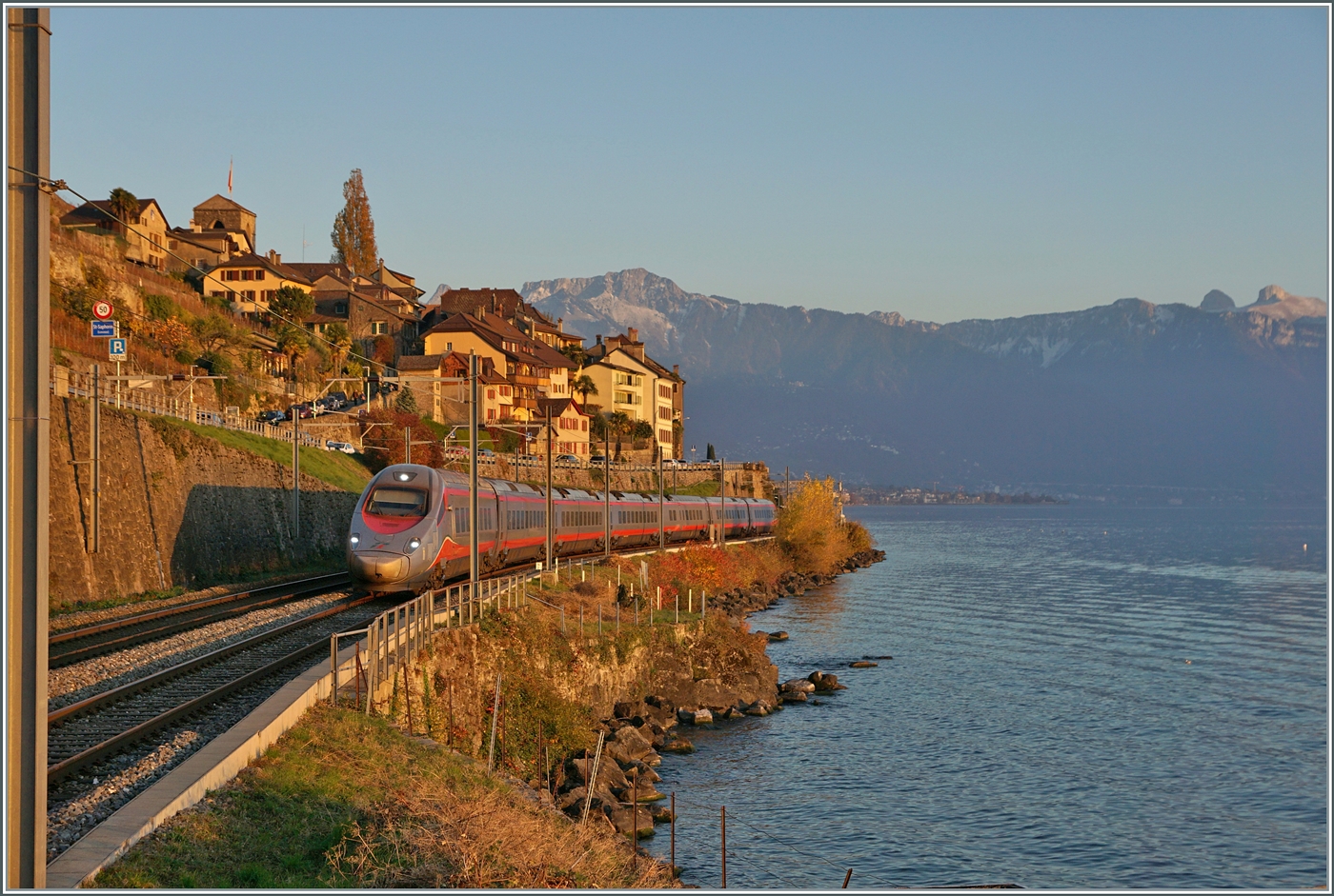 Während hinter meinem Rücken die Sonne unter geht, ist zwischen St-Saphorin und Rivaz der FS Trenitalia ETR 610 002 als EC 30008 auf dem Weg von Domodossola nach Genève Aéroport.