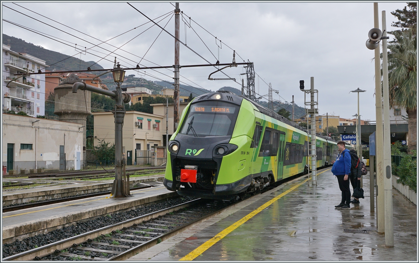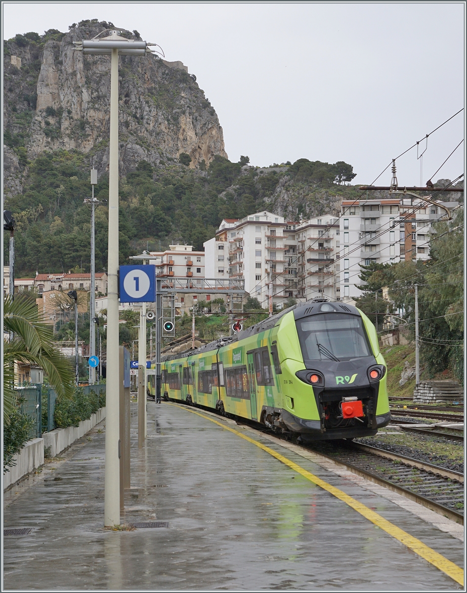 Ein FS Trenitalia HTR 412 "Blues" ist als R 5361 von Messina nach Palermo unterwegs und erreicht Cefalù.