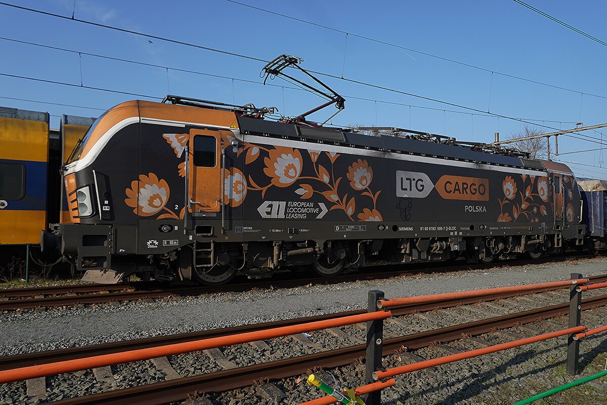 LTG Cargo 193 509 steht mit ein Getreidezug am 3 März 2026 in Oss, wo Arbeit bei die Gleise dieser Fotostandpunkt etwas versauert hat.