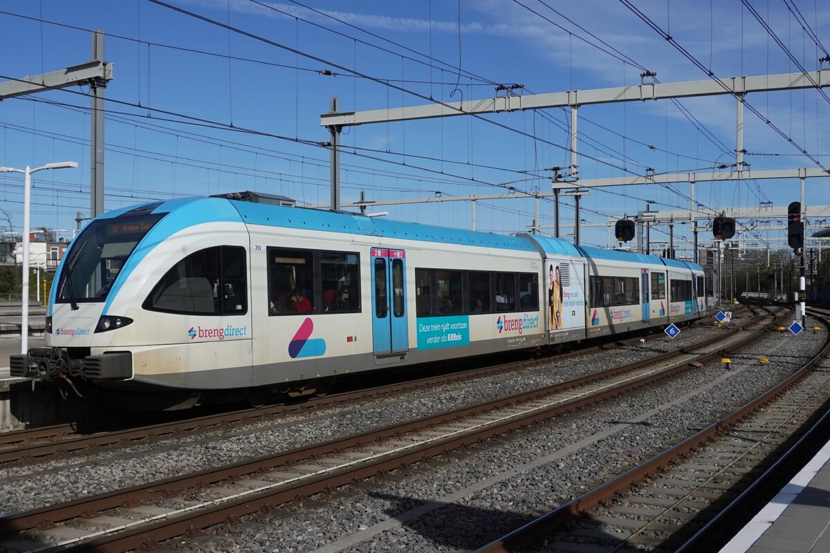 Drei Diesel-Elektrische Stadler GTW 2/8 in Dreifachtraktion, die gekuppelten 5044, 5042 und 5045, drei gekuppelte dreiteilige diesel-elektrische Stadler GTW 2/8 der BrengDirect (Connexxion/Hermes Groep, Teil der Transdev Nederland) verlassen 29 April 2025, als Regionalzug (Stoptrein) RS 32 nach Doetinchem, den Bahnhof Arnhem Central (Arnheim Hbf). In den Hauptverkehrszeiten fahren die Züge der Breng Direct, von Arnhem Central nach Doetinchem im Viertelstunden-Takt, bzw. weiter bis Winterswijk im Halbstündlichen Takt.