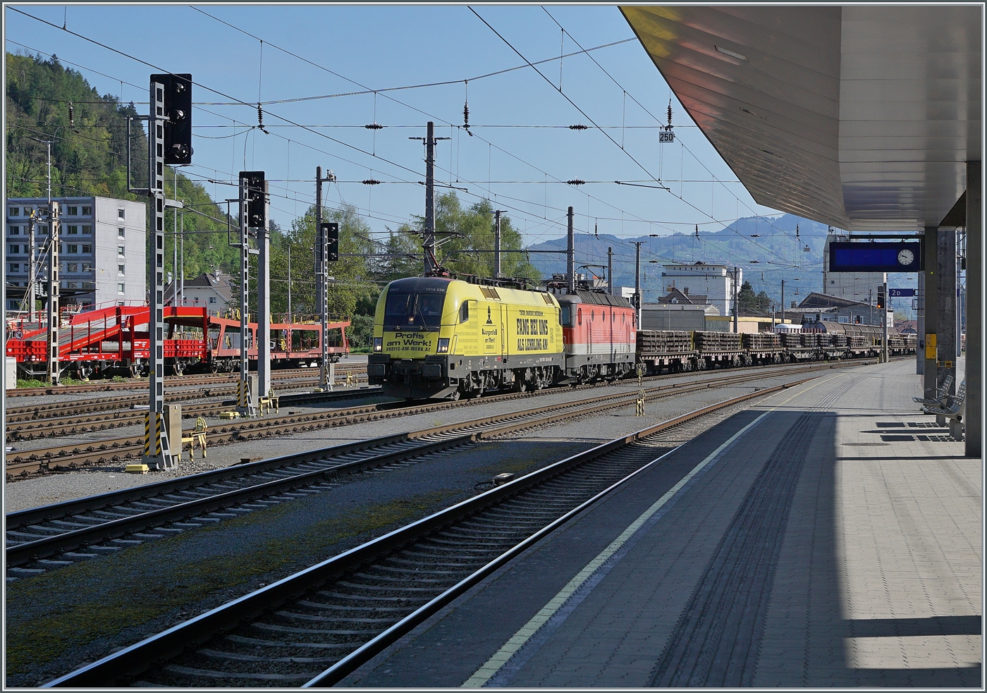Die ÖBB 1016 020-0 und die ÖBB 1144 204-5 warten mit einem Güterzug beladen den ausgedienten Streckengeleisechen Götzis und Rankweil in Feldkirch auf die Abfahrt in Richtung Arlberg. 21. April 2026 Stefan Wohlfahrt
