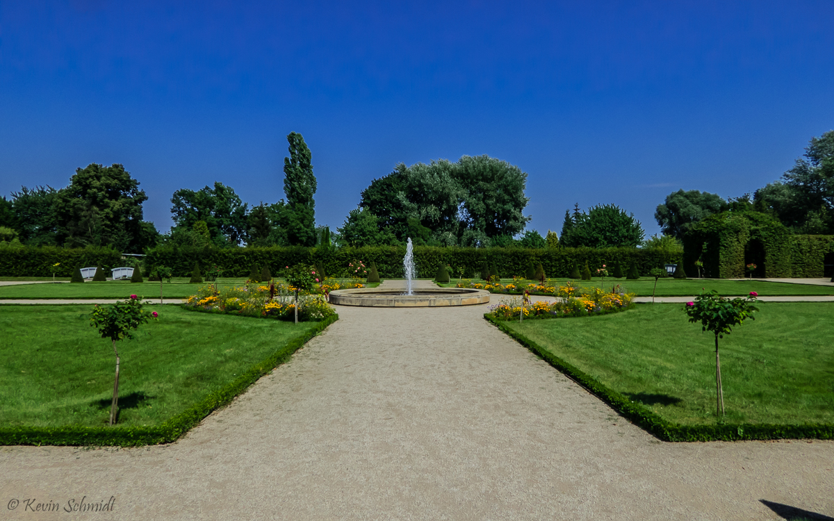 Der ehemalige Abtsgarten des Klosters Neuzelle wurde ursprünglich um 1755 angelegt und ab 1994 originalgetreu wiederhergestellt. Hier, im Bereich des Broderie-Parterres innerhalb des barocken Klostergartens, befindet sich ein zentraler Springbrunnen. (01.08.2017)