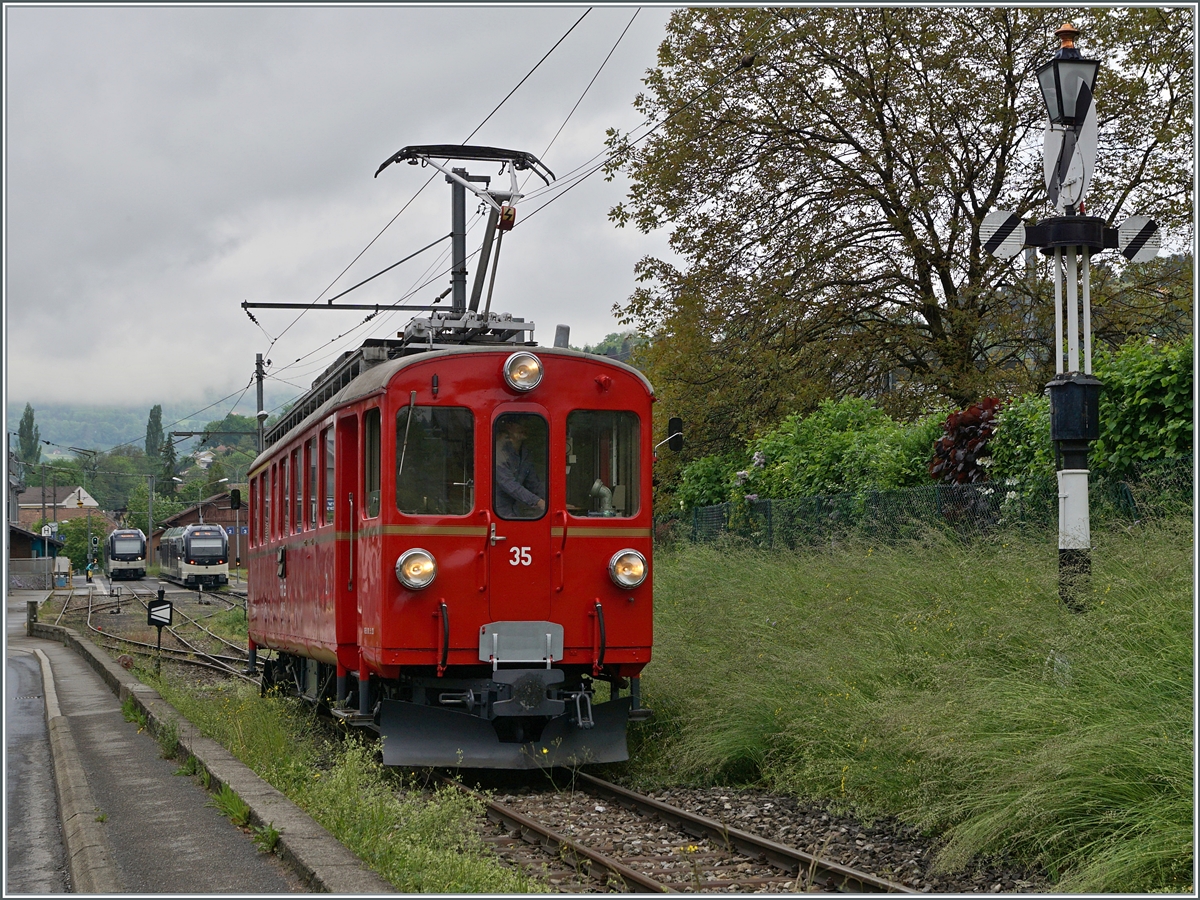 Der Blonay-Chamby "Riviera Belle Epoque" Zug, bestehend aus RhB ABe 4/4 35 und dem CEV C 21 warten in Blonay auf die Abfahrt nach Vevey.