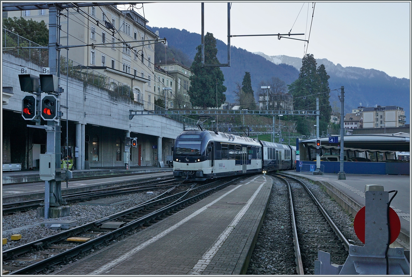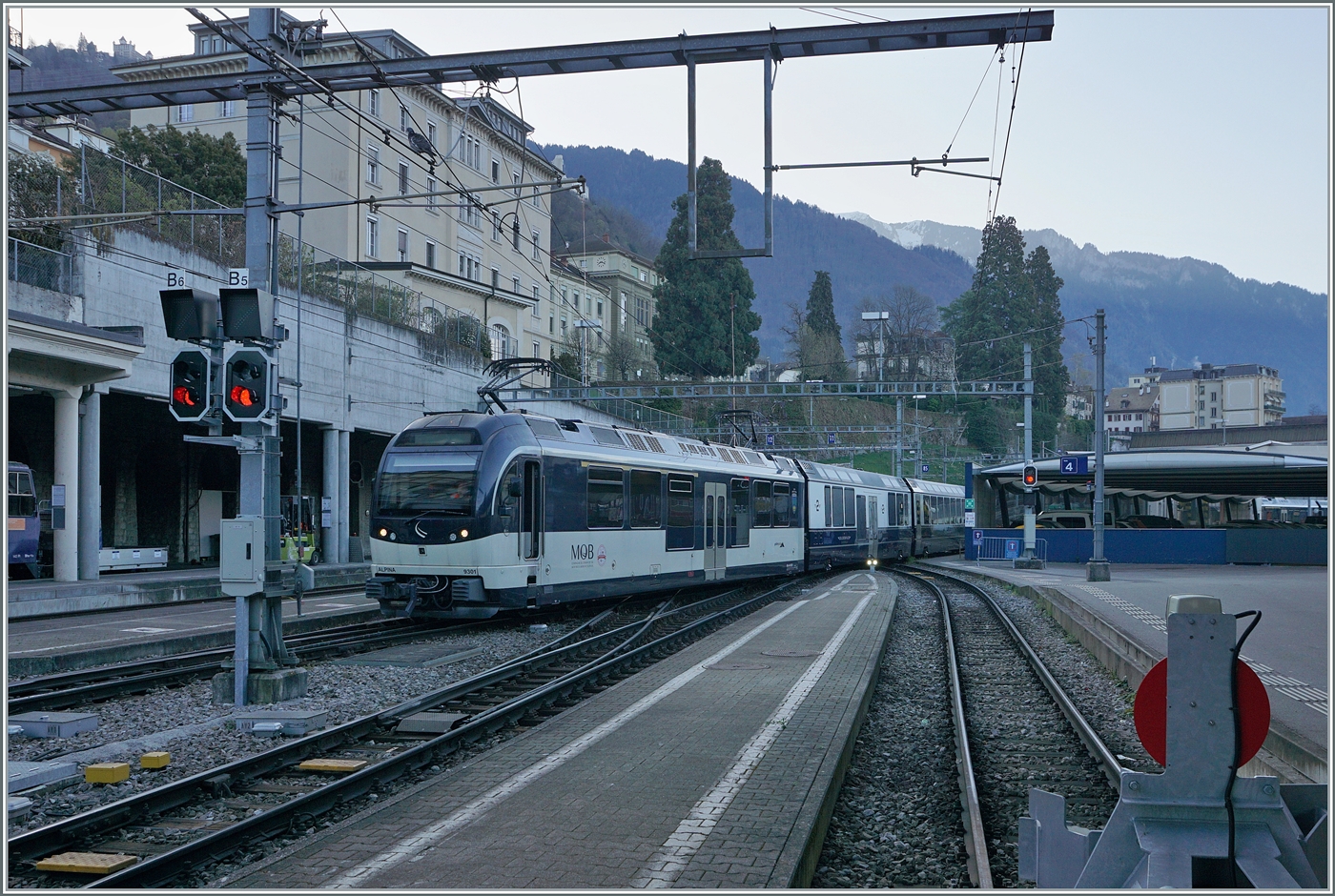 In Montreux wird der MOB Alpina Be 4/4 9204 gründlich geputzt und dies mitten im Winter.