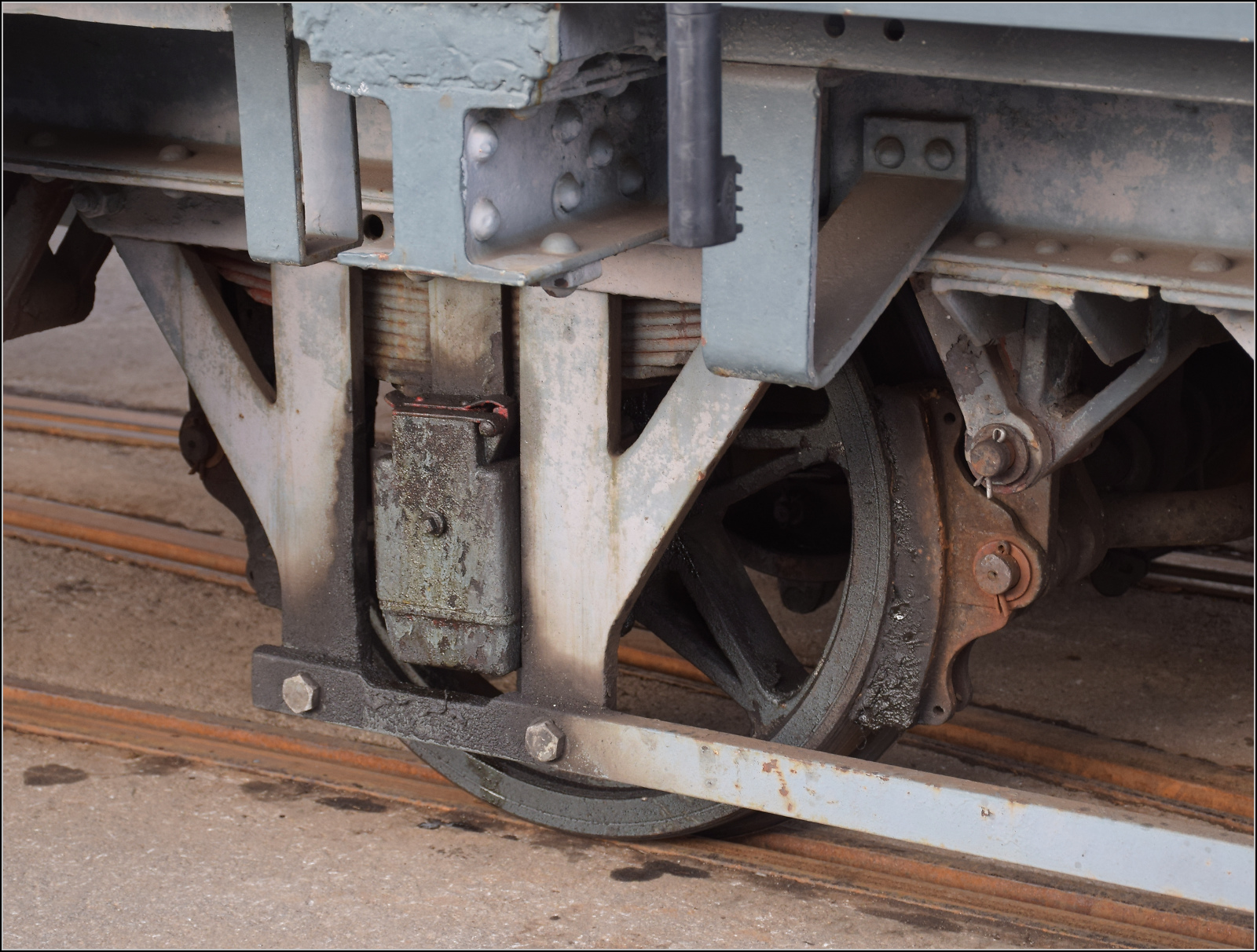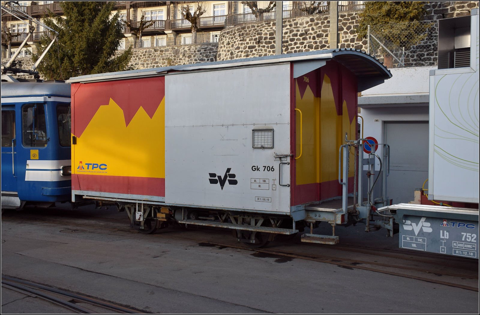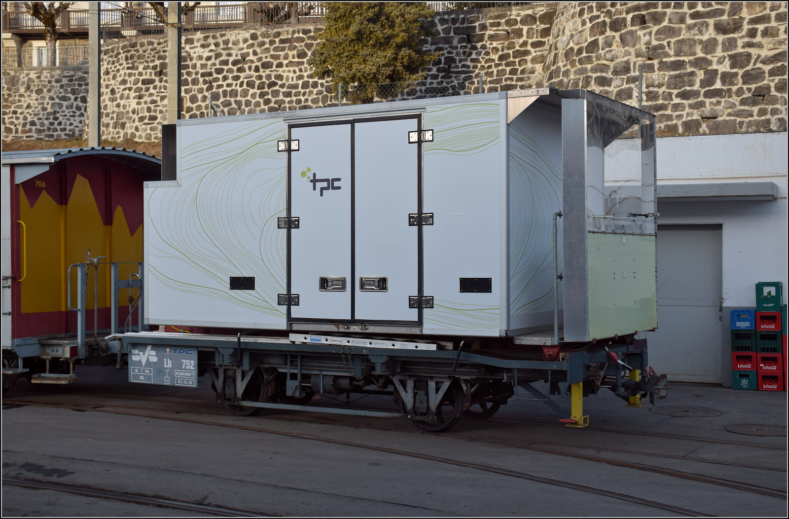Eine genaue Betrachtung dieses unbekannt gebliebenen Wagens lässt sein Alter auch auf über 100 Jahre vermuten. Von der Konstruktion ähnelt er dem Wagen L 302. Dahinter der BVB-Flèche Beh 2/4 25 aus dem Jahr 1944. Villars-sur-Ollon, Januar 2026.