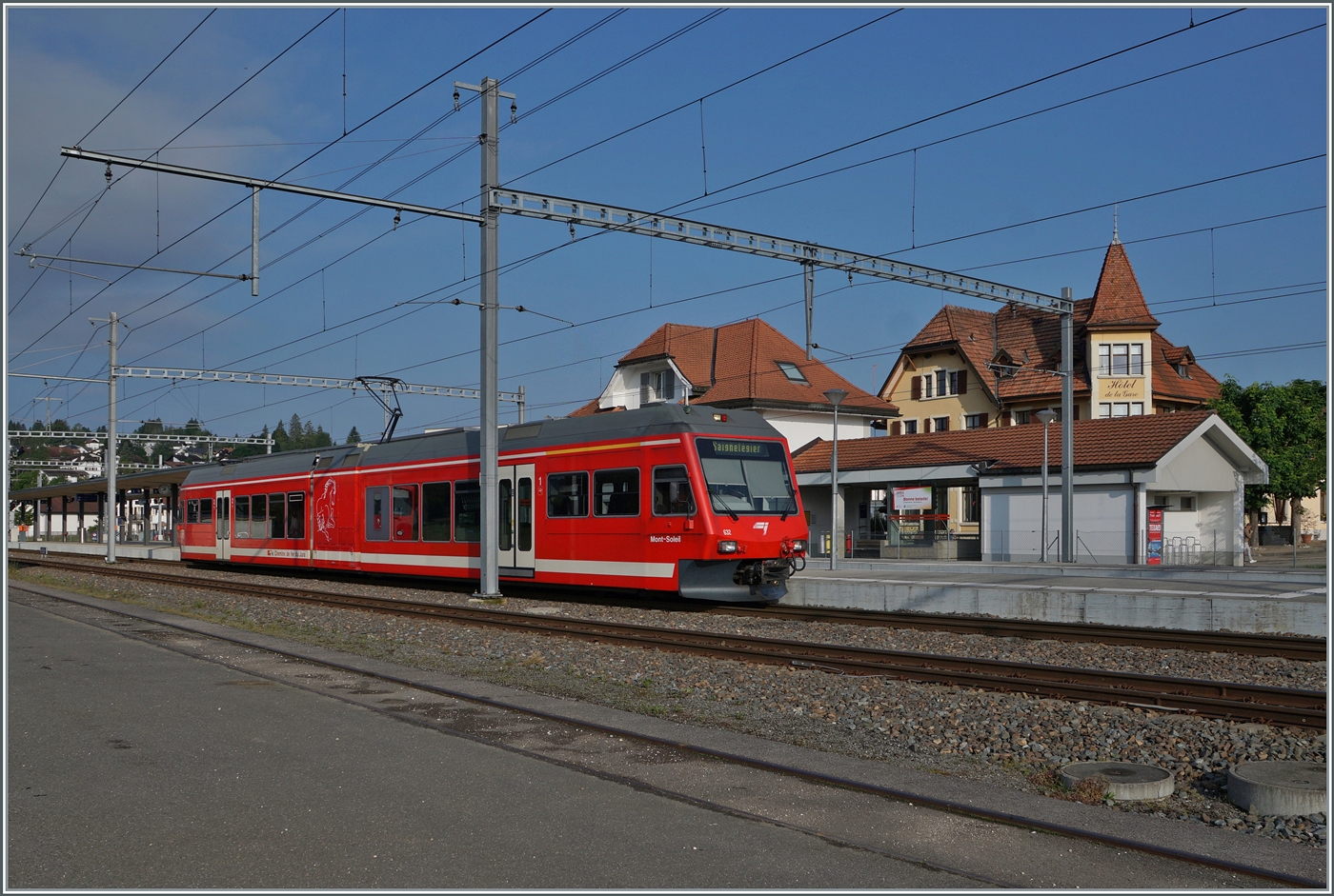 Im Bild steht ein GTW ABe 2/6 in Yverdon, während im Hintergrund ein SBB RABe 523 in den Bahnhof einfährt.