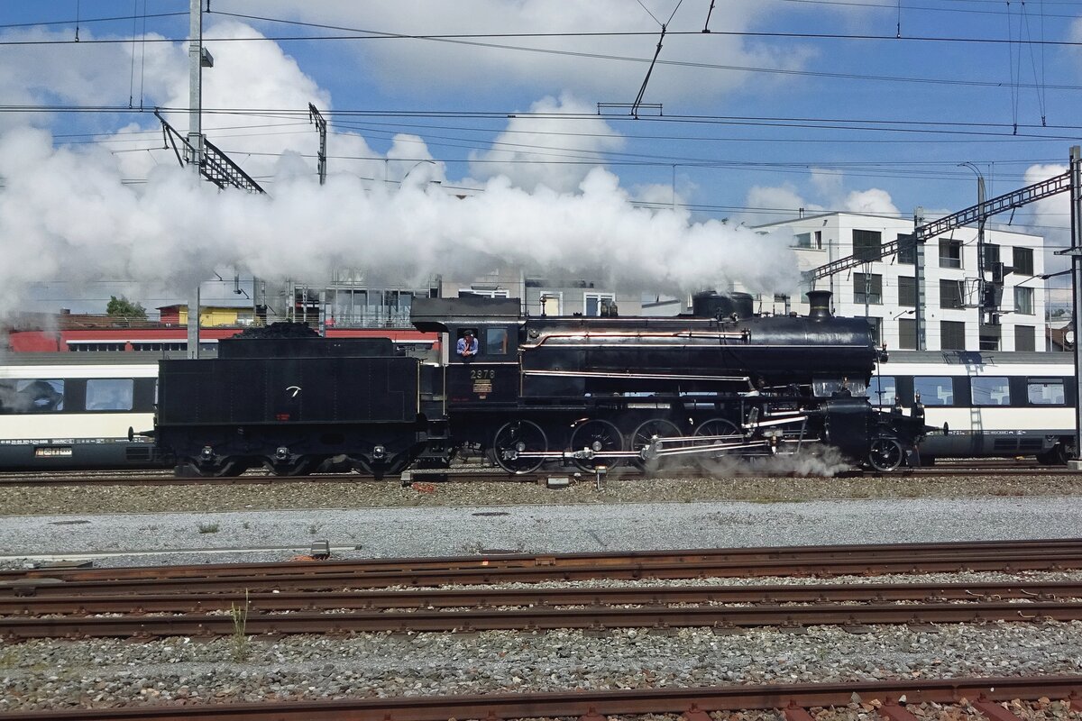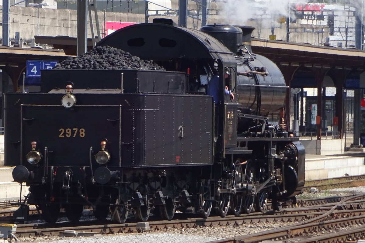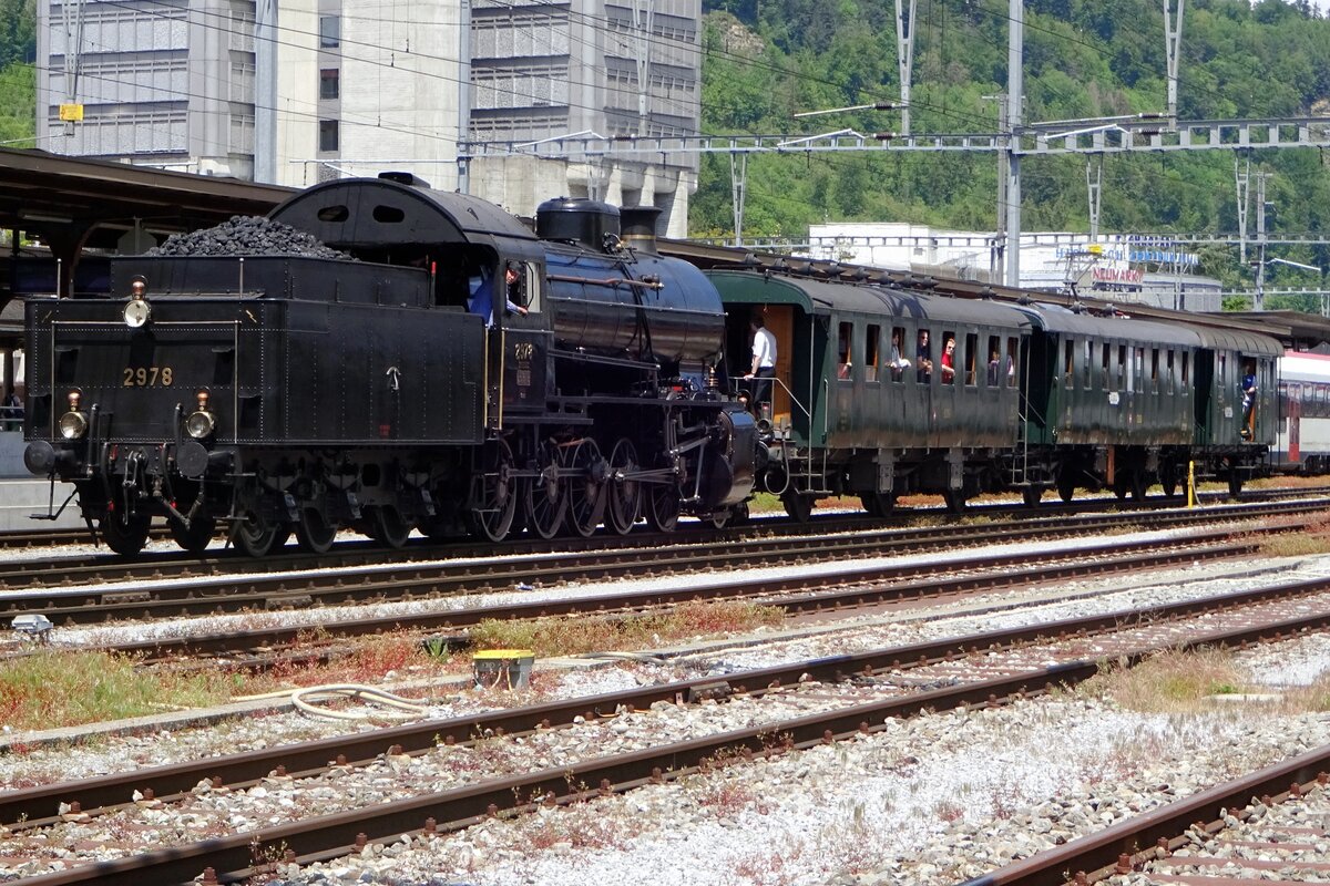 Im Sommer 1997 warten C 5/6 2978 und B 3/4 1367 mit ihrem Sonderzug im Bahnhof Delemont auf die Abfahrt nach Glovelier