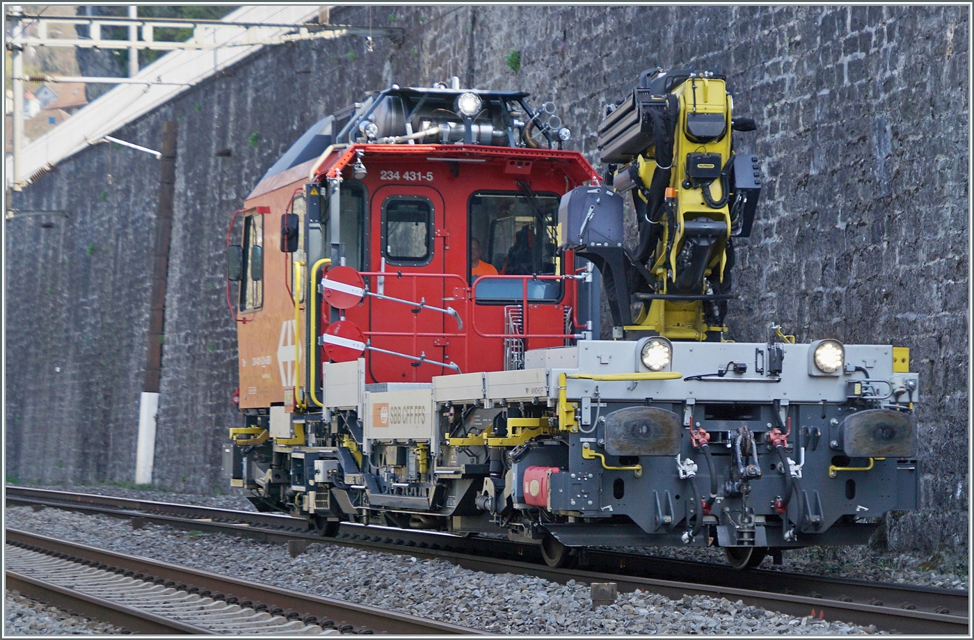 Der SBB Infrastruktur "Dart" (Windhoff) Tm 234 431-5 ist kurz nach der Haltestelle Veytaux Chillon auf dem Weg in Richtung Villeneuve.