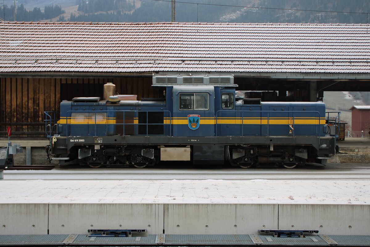 Autour de la voie ferrée / Rund um die eiserne Bahn (Herbstevent 2024) - Zu diesem Thema gehören natürlich auch all die fahrdrahtunabhängigen Loks die für den Unterhalt der Bahn zuständig sind. So war es eigentlich recht naheliegend, die MOB Gm 4/4 N° 2004 beim Herbstevent zu zeigen. Die MOB besitzt zwei dieser Loks, hier ein paar Worte dazu: Die MOB erhielt 1976 die Diesellok Gm 4/4 2003, um ein leistungsfähiges, fahrleitungsunabhängiges Fahrzeuge für entsprechende Einsätze zur Verfügung zu haben. Die französische Firma Moyse in La Courneuve konstruierte die Lok, die sich bei der MOB sehr bewährte, so dass die MOB eine zweite Gm 4/4 bestellte. Die Firma Moyse, ging jedoch während des Baus der Gm 4/4 2004 in Konkurs. Somit konnte die Gm 4/4 2004 erst 1982 in Dienst gestellt werden, nachdem die Firma CFD (Montmirail) die Arbeit an der der Gm 4/4 2004 fortsetzen und beenden konnte. Im Bild nun die Gm 4/4 2004 die in Chaulin verlässt.