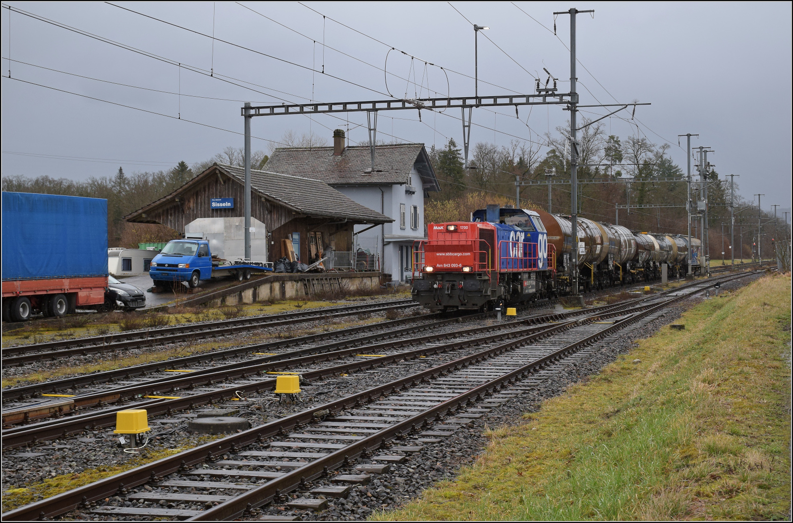 Schlechtwetter und ein Baustellendrama bei Frick. Am 843 093 wartet mit einigen Kesselwagen in Sisseln zwei Gegenzüge ab. Februar 2026.