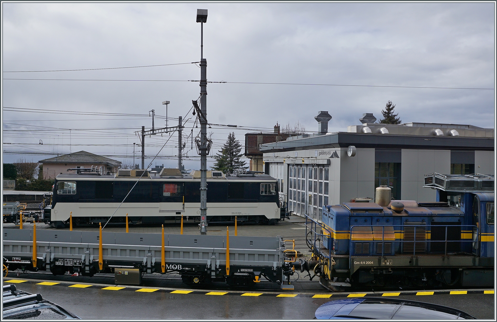 Ein Blick in den "Hinterhof" der MOB mit der abgestellten GDe 4/4 6006 (ex GMF/TPF) und einen GEX. 29. April 2025