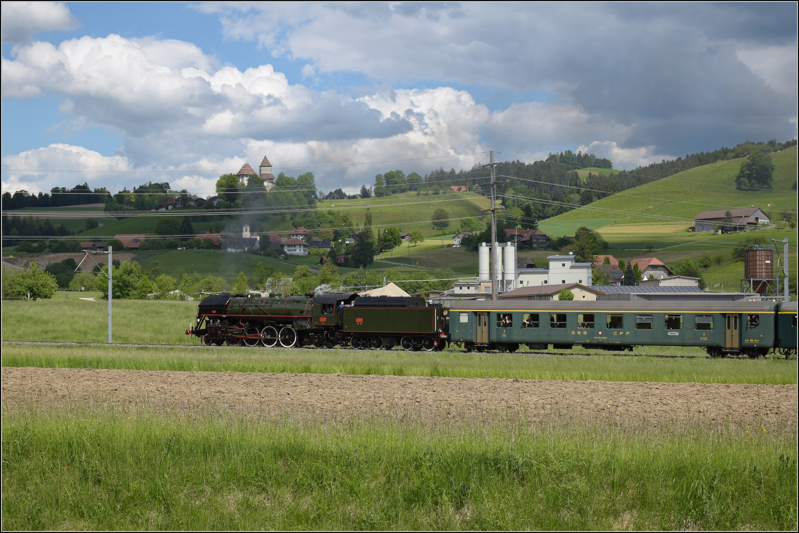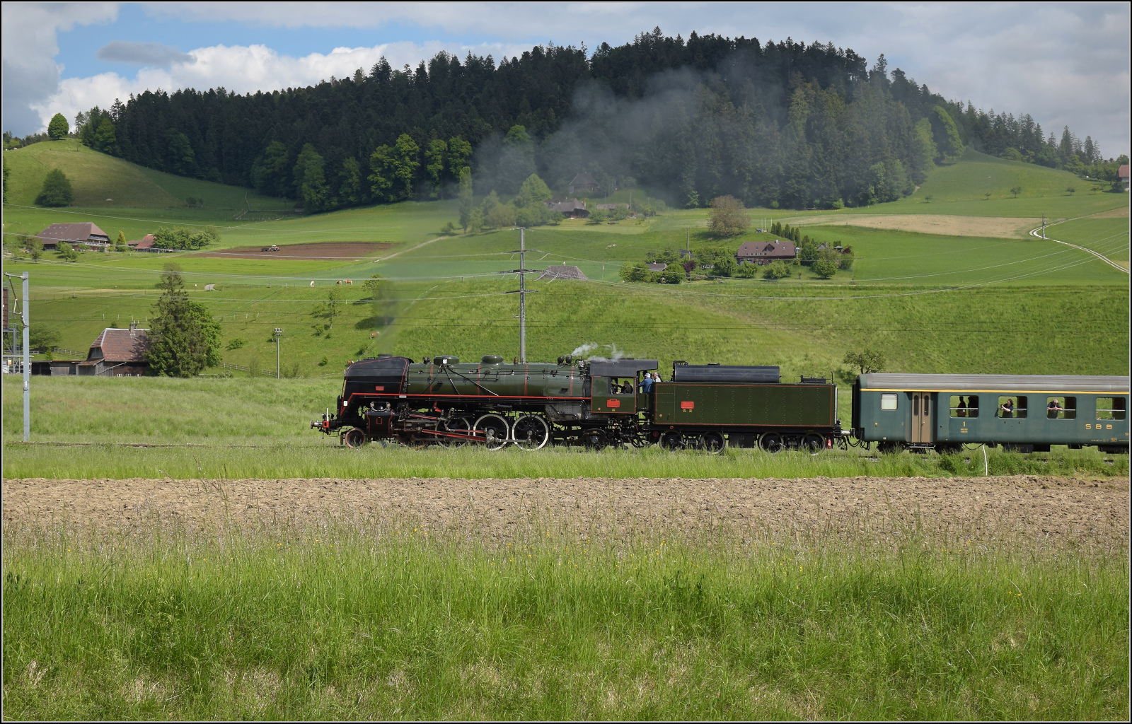 141-R-1244 auf dem Rückweg von der grossen Emmentalrundfahrt anlässlich des Jubiläums. Bei Unterengg, Malters geht es bereits die Steigung nach Littau hinauf, während im Hintergrund die Königin der Berge wartet. Am Zugschluss hilft Ae 6/6 11407 'Aargau' noch ein wenig mit. Mai 2025.