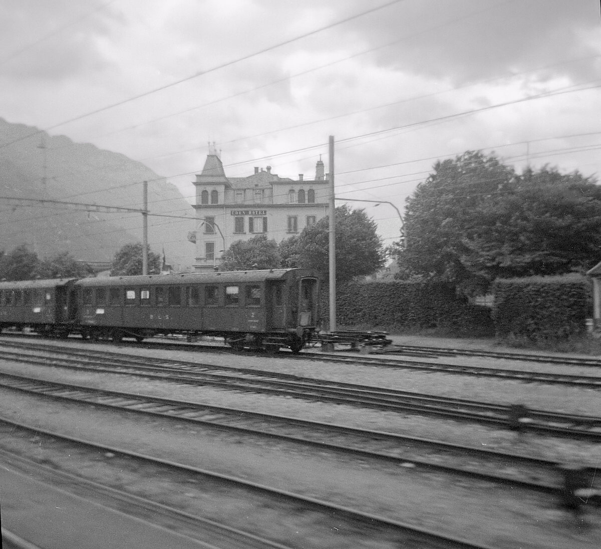 Schwere Altbauwagen der BLS: 1911/12 beschaffte die BLS 32 Wagen für den internationalen Verkehr mit Seitengang (20 AB4 und 12 C4) und 1914 für den innerschweizerischen Verkehr 9 C4 mit Mittelgang. Sie hatten Holzkasten mit Metallverkleidung. Ende 1940er/Anfang 1950er Jahre wurden 25 Seitengangwagen nach Umbau zu Mittelgangwagen. Einige dieser alten Wagen waren in den 1960er Jahren noch vorhanden. Im Bild steht Ce 4/4 311 mit einem Güterzug in Wabern, an erster Stelle ein alter BLS-Vierachser, möglicherweise B 885; ich vermute, er hat noch Holzkasten mit Metallverkleidung. Wabern, 8.März 1967. (Links noch die alte Gaswerkbahn Bern)