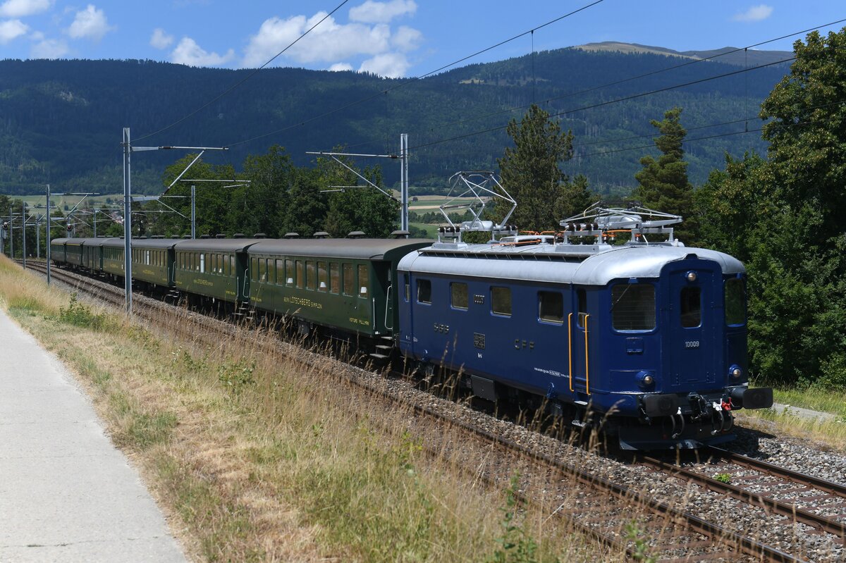 CentralBahn 10009 steht am 17 Mai 2025 in Konolfingen während das Bahnfest "150 Jahre EmmentalBahn" das über das ganze Emmentalbahnnetz gefeiert wurde. Dieser Version der SBB Re 4/4I ist keine Phantasie, hat es jedoch tatsachlich gegeben. IN 1956 erprobten die SBB einige Lackierungen für deren Lokomotiven und 10009 bekam das dunkelblau, das sich stark anlehnt an das Berliner Blau der Nederlandsche Spoorwegen ab 1954. Zwei Jahre später entscheideten die SBB für das dunkle Tannengrün.