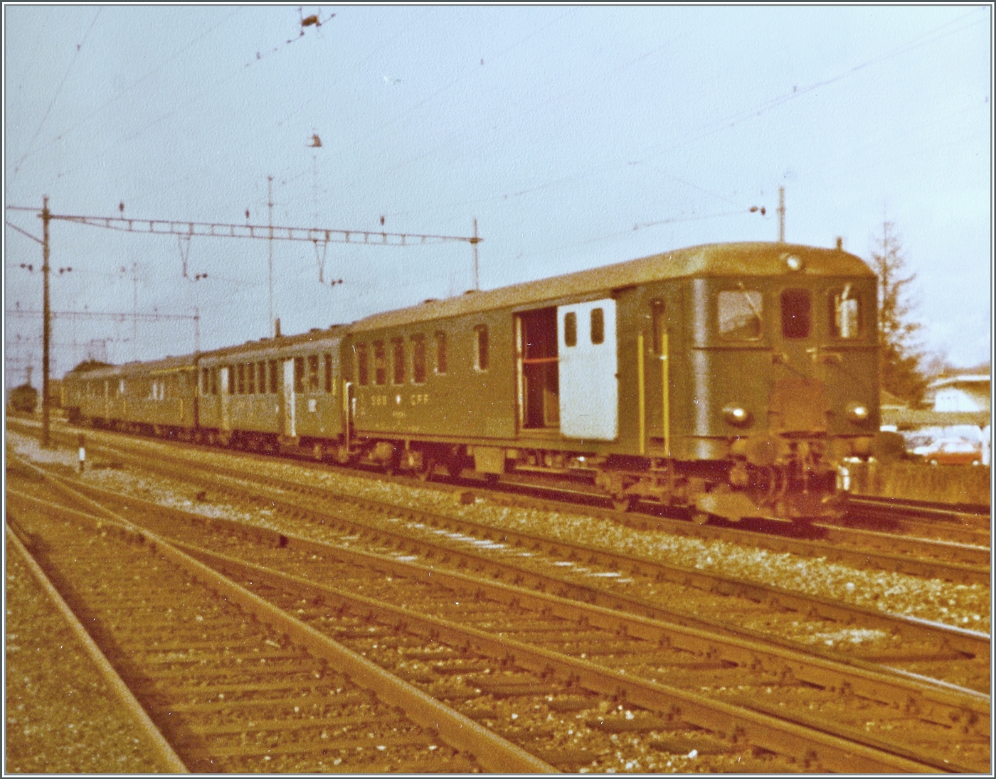 Die SBB Re 4/4 II 11162 hält mit ihrem Regionalzug nach Arth Goldau in Wohlen kurz an. Neben der Lok sind natürlich besonders die damals im Regionalzugverkehr eingesetzten Wagen von Interesse und, ganz selbstverständlich steht am Güterschuppen ein gedeckte Güterwagen zum verladen von Stückgüter, dank RIV EUROP konnten damals alle Wagen der teilnehmenden Bahnen freizügig verwendet werden.