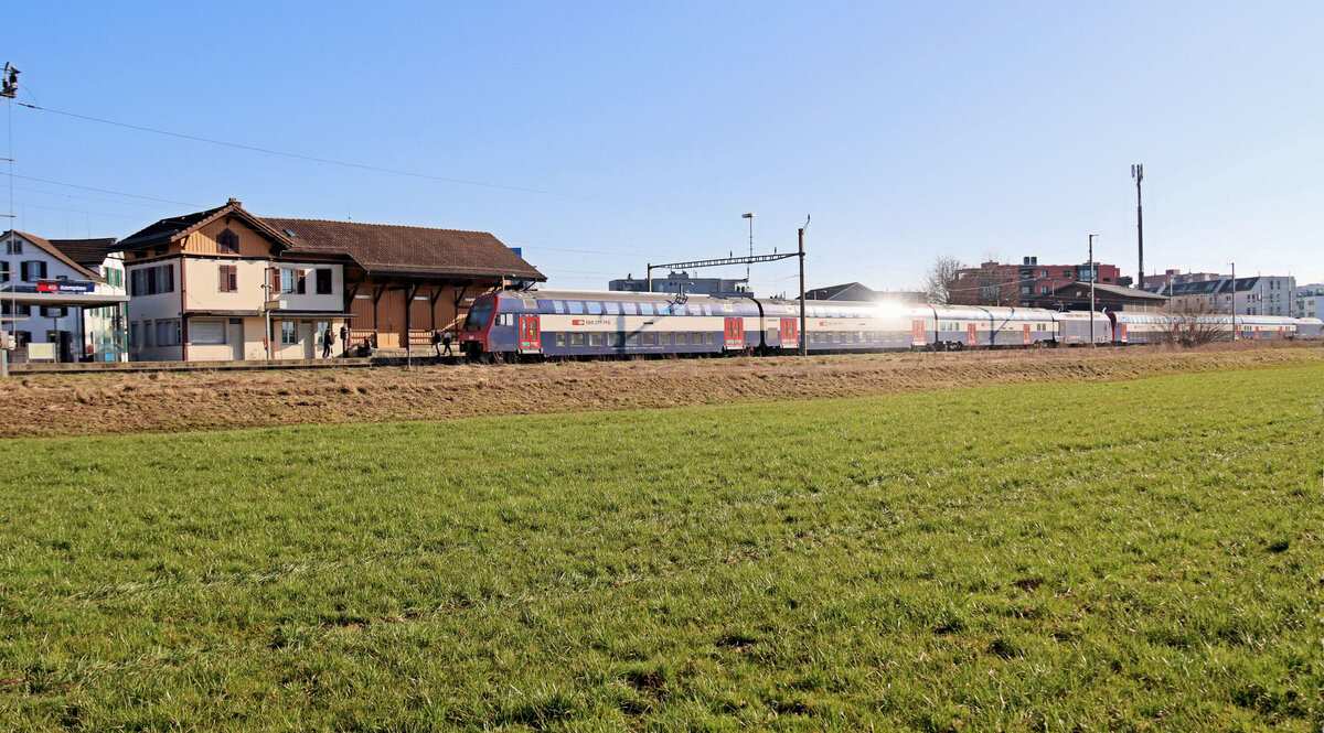 Die Kempttalbahn: Lok 450 053 stösst ihren S-Bahnzug nach Zürich Hardbrücke Richtung Pfäffikon ZH. Vor der Lok ein Doppelstockwagen Serie 26-73 aus der ab 2011 gebauten Serie von 113 Wagen  DPZ Plus  für die SBB. 5.März 2025