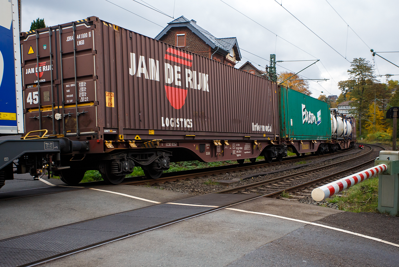 Drei vierachsige Drehgestell-Containertragwagen 48‘ («5L» Tragwagen) 33 85 4505 185-0 CH-WASCO dahinter 33 80 4505 683 D- WASCO sowie ein weiterer leerer (Nummer unbekannt), jeweils der Gattung Sgmmns 48‘, für den Transport von intermodalen Ladeeinheiten und des Wascosa flex freight system ® (Wechselaufbauten), der schweizerischen Wascosa AG, am 11 Juli 2025 im Zugverbund bei einer Zugdurchfahrt in Ruderdorf (Kr. Siegen). Die beiden vorderen Wagen sind jeweils mit einem vom belgischen Hersteller Van Holl gebauten, 45 ft Tankcontainer (MK2) der BASF, der hier laut Gefahrguttafel 80/1789 und Anschrift mit Chlorwasserstoffsäure (Salzsäure) befüllt sind.