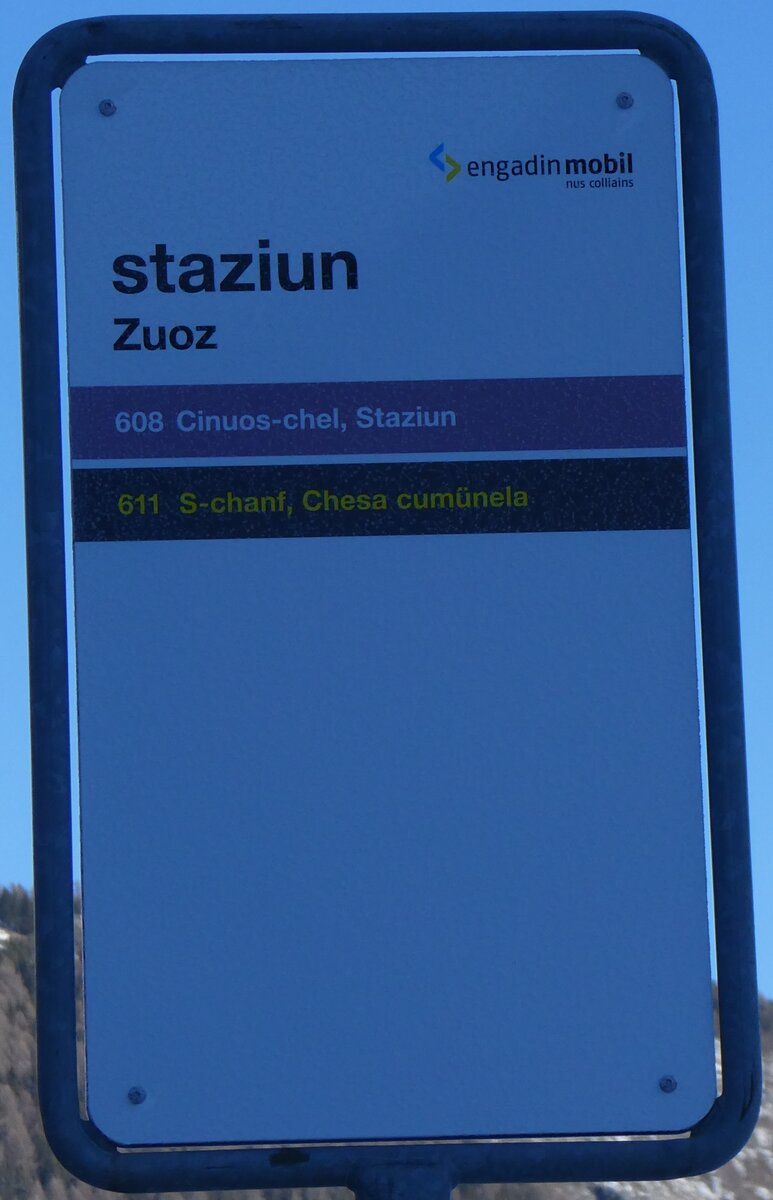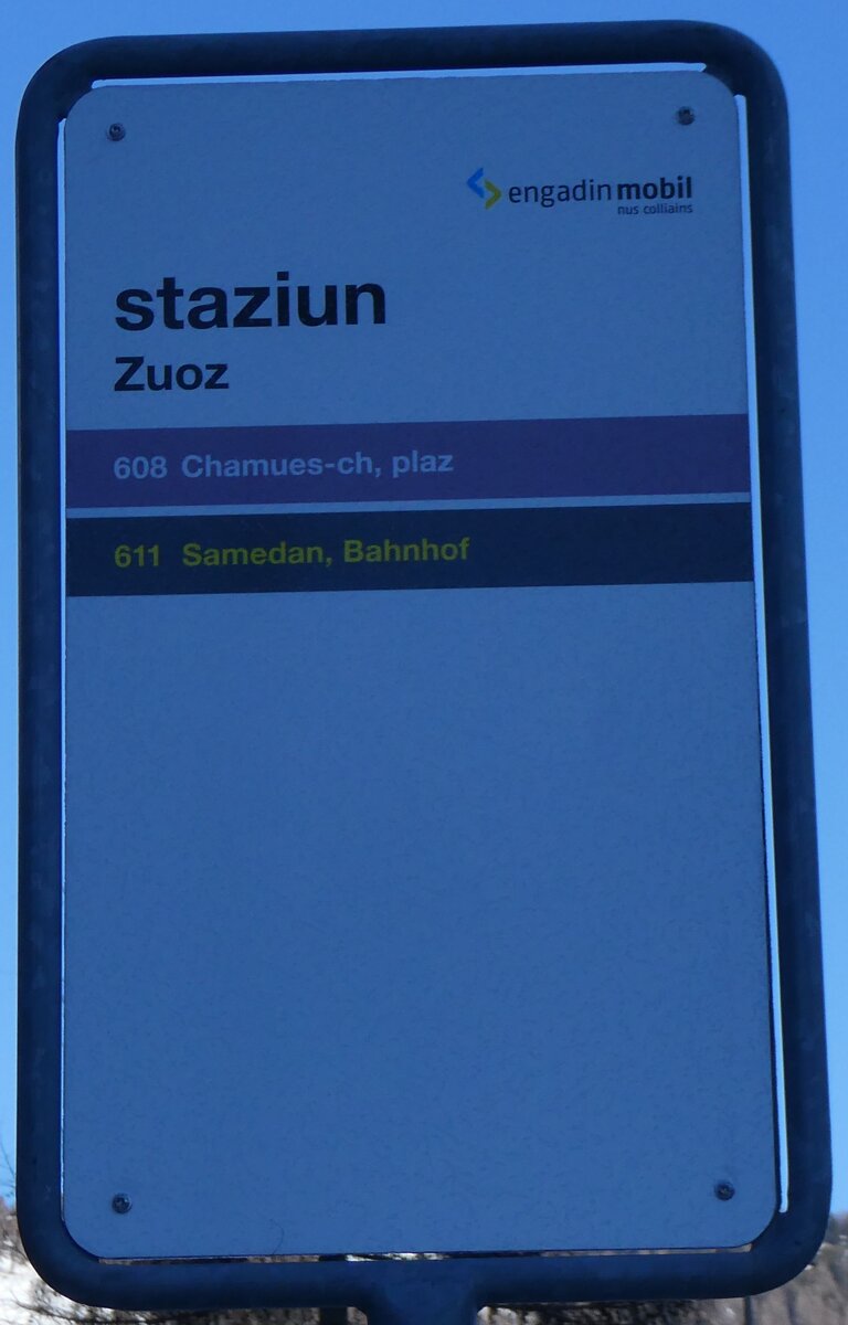 (178'410) - engadin mobil/PostAuto-Haltestellenschild - St. Moritz, Bahnhof - am 9. Februar 2017