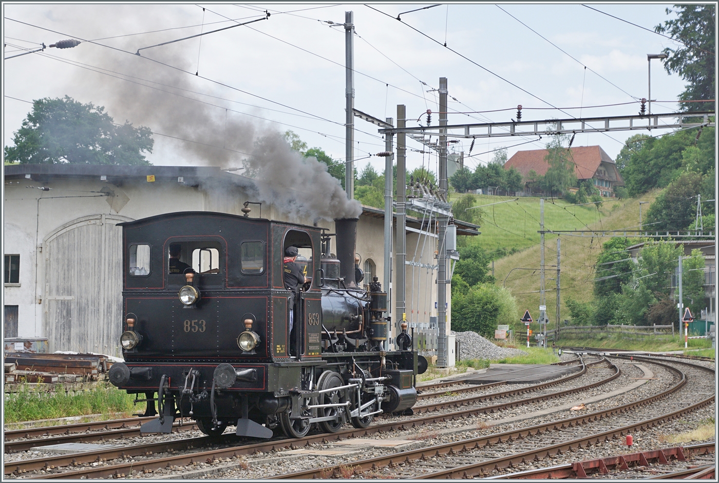 Die E 3/3 853 der DBB mit der UIC Nummer 90 85 0008 573-7 verlässt mir ihrem ersten Dampfzug Sumiswald Grünen in Richtung Wasen im Emmenthal.