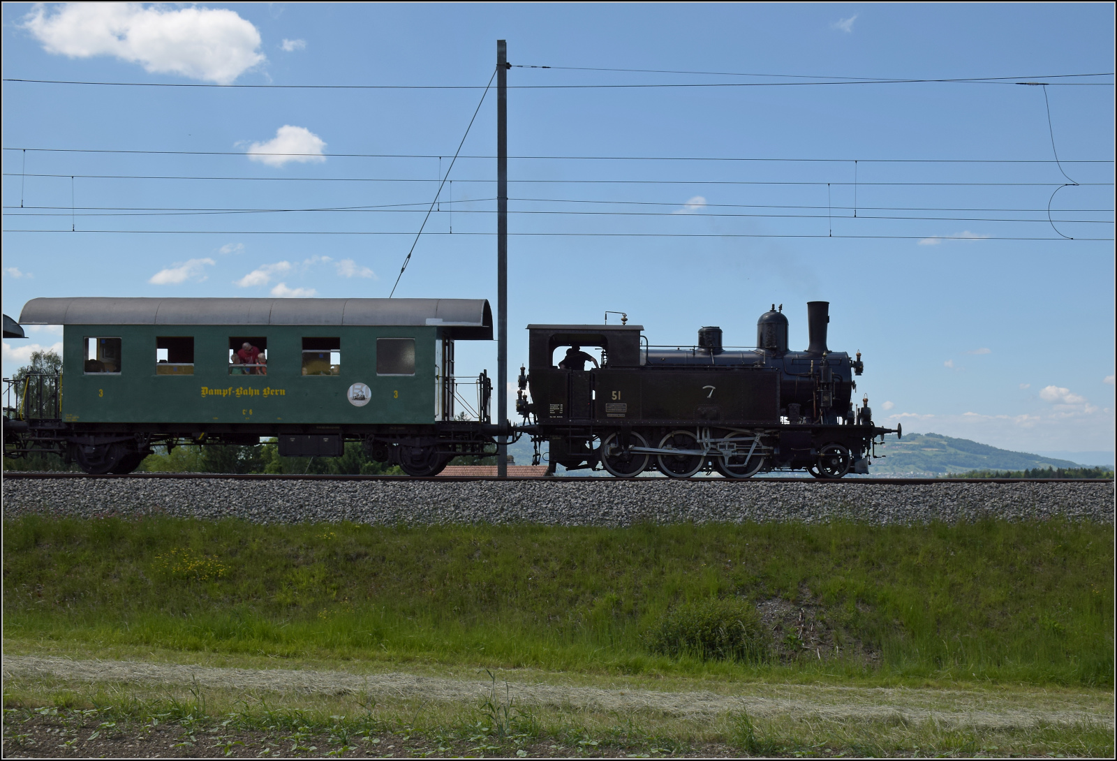 BSB-51 pendelt am 18 Mai 2025 zwischen Bahnhof und BLS-Werkstätte Koninlfingen während das Spektakel "150 Jahre Emmentalbahn".