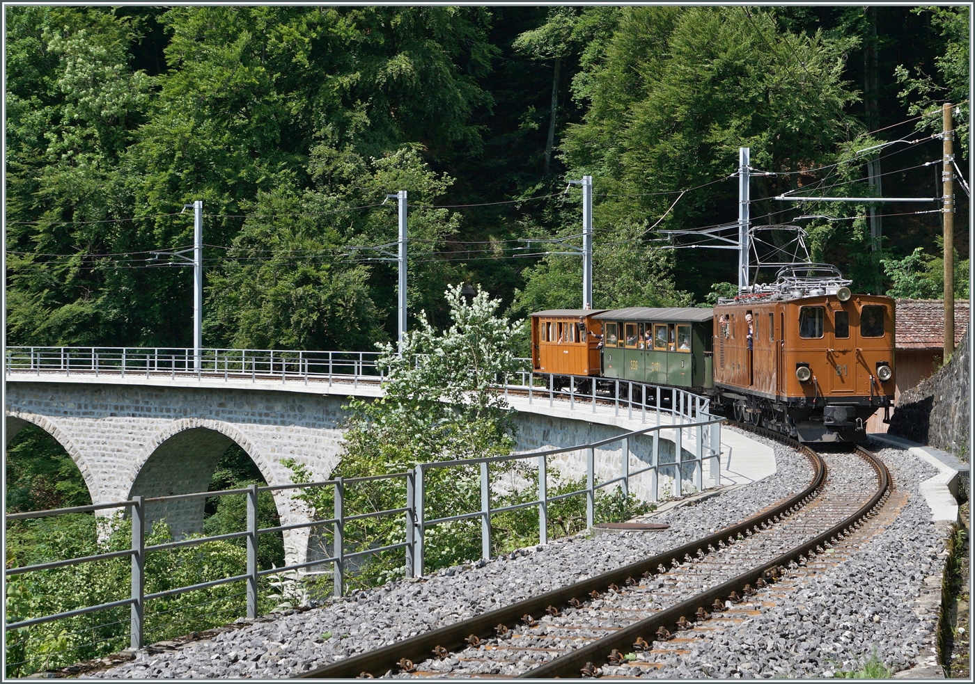 Die Bernina Bahn RhB Ge 4/4 81 der Blonay-Chamby Bahn ist mit ihrem recht gut besetzten Riviera Belle Epoque Zug von Chaulin auf dem Weg von Chaulin nach Vevey und wartet in St-Légier Gare auf den Gegenzug.