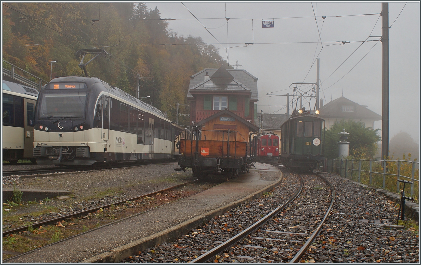 Erneut zeigt sich die Blonay-Chamby Bahn G 2x 2/2 105 in Chamby, nun vor dem hervorragend renovierten Empfangsgebäude (und dem wieder als Parkplatz genutzten Bahnsteig). zur Zeit.