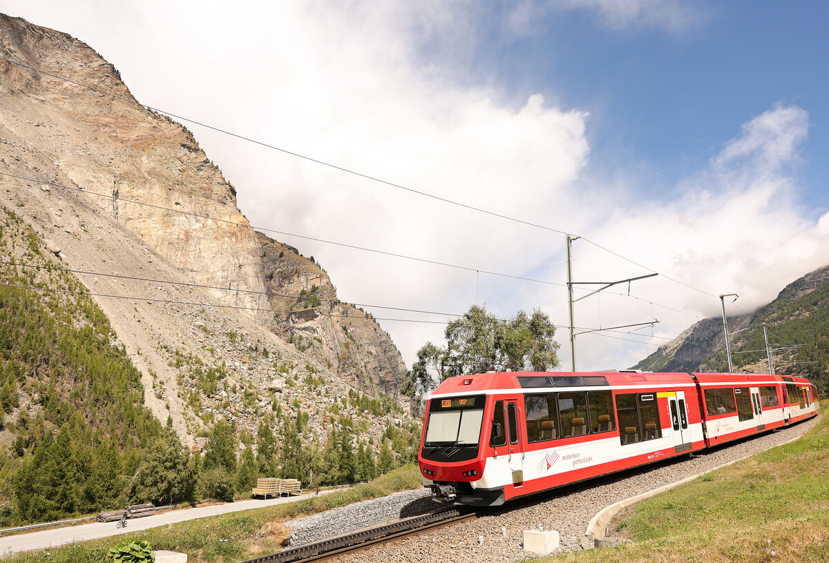 Der GoldenPass MOB Panoramic Zweisimmen - Montreux PE 2111 mit dem Ast 152 an der Spitze, der GDe 4/4 6004 "Interlaken" als Zug-Lok und dem Ast 116 am Zugschluss zeigt sich kurz vor nach Sendy-Sollard.