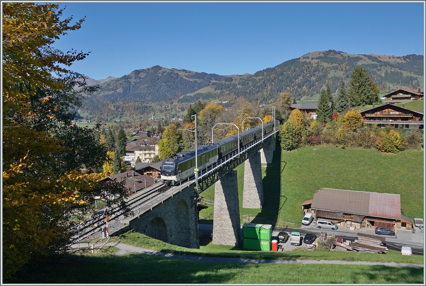 Kurz nach Gstaad ist die MOB Ge 4/4 8004 "Swisstainable" mit dem GoldenPass Express PE 4069 auf der Fahrt von Interlaken Ost nach Montreux.