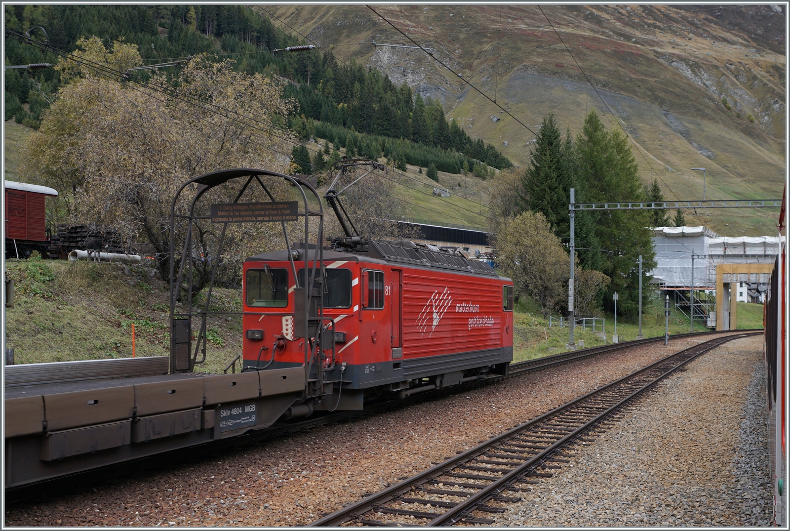 Die MGB Ge 4/4 III 82 "URI" steht mit einem Auto-Tunnel Zug in Realp.