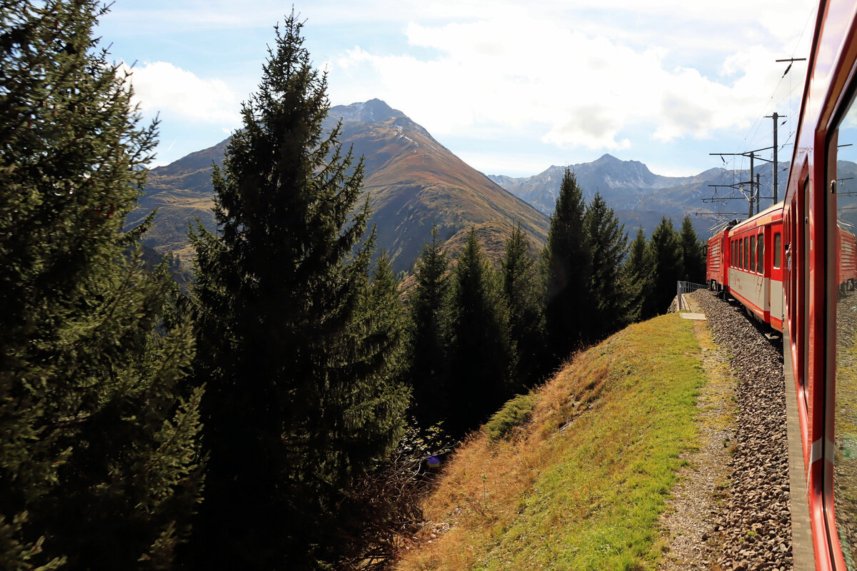 Matterhorn-Gotthard Bahn MGB: Das Bedürfnis nach Fenstern, die geöffnet werden können, ist eindeutig. Hier erklimmt ein Zug hinter HGe4/4 105 die letzten Meter bis zur Oberalppasshöhe. 21.September 2022