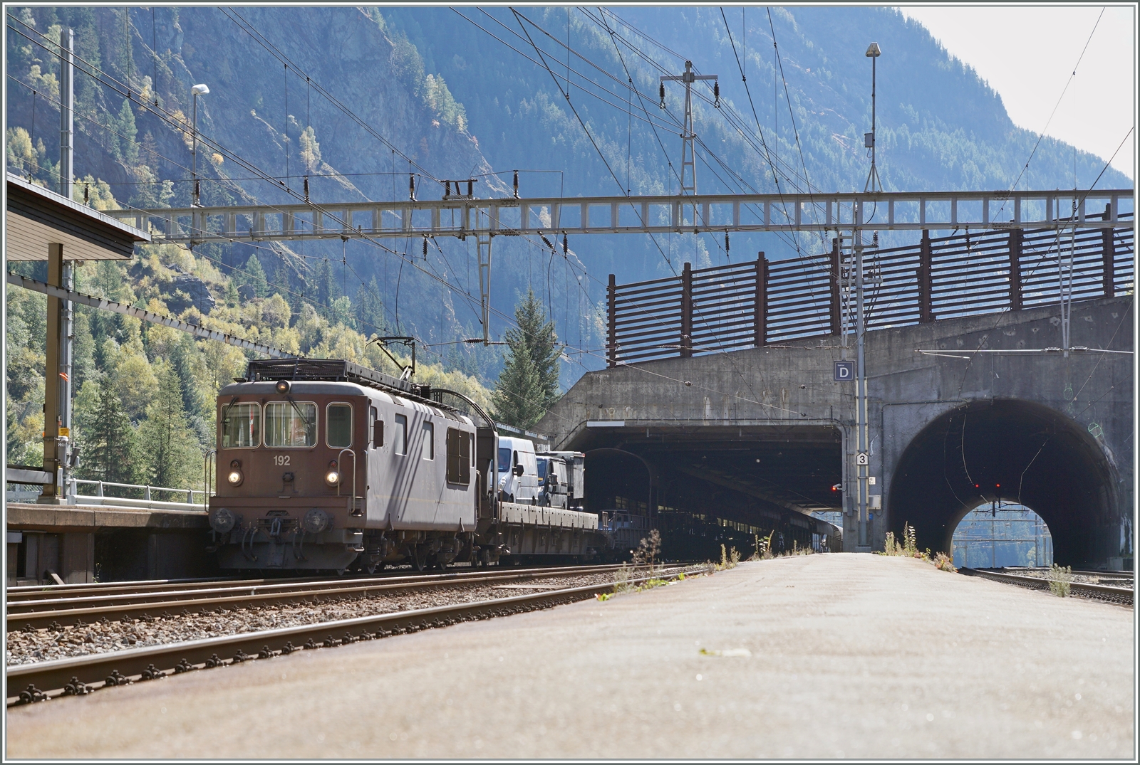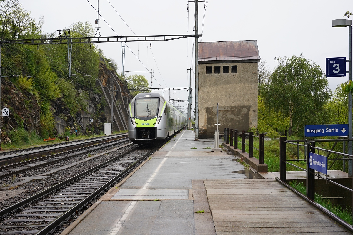 Die BLS Re 4/4 503 (ex SBB RE 4/4 II 11119) kurz vor Ankunft in Lalden mit einem ebenso bunten, wie langen RE von Bern oder Spiez (?) nach Brig am 8. Feb. 2008