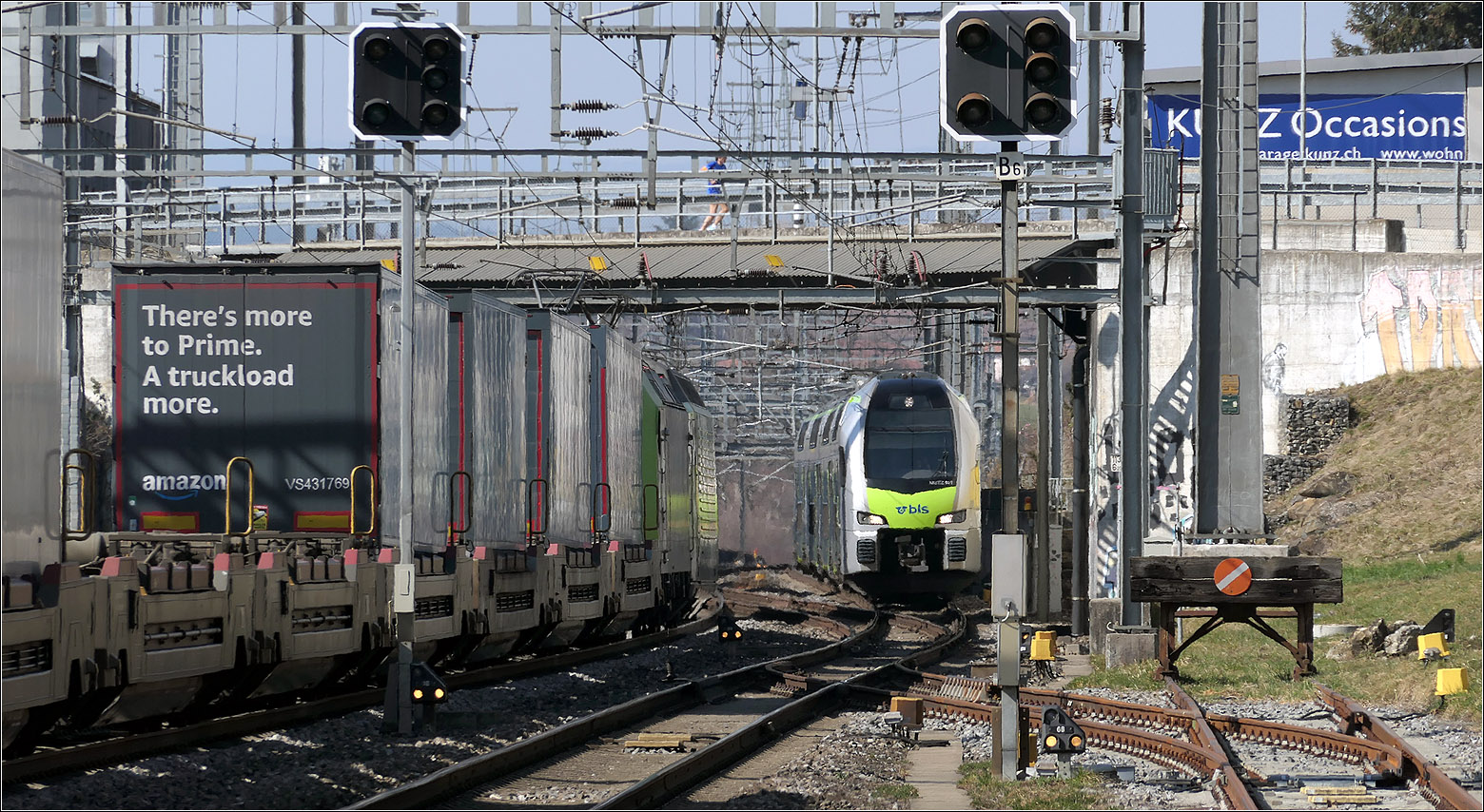 An der nordwestlichen Ausfahrt aus dem Bahnhof Gümligen begegnet der Güterzug den RABe 515 der als S1 nach Thun unterwegs ist.