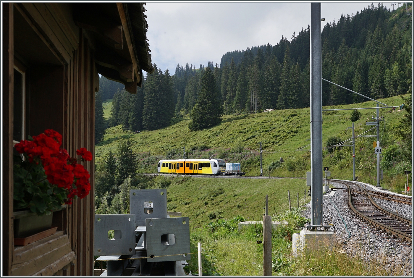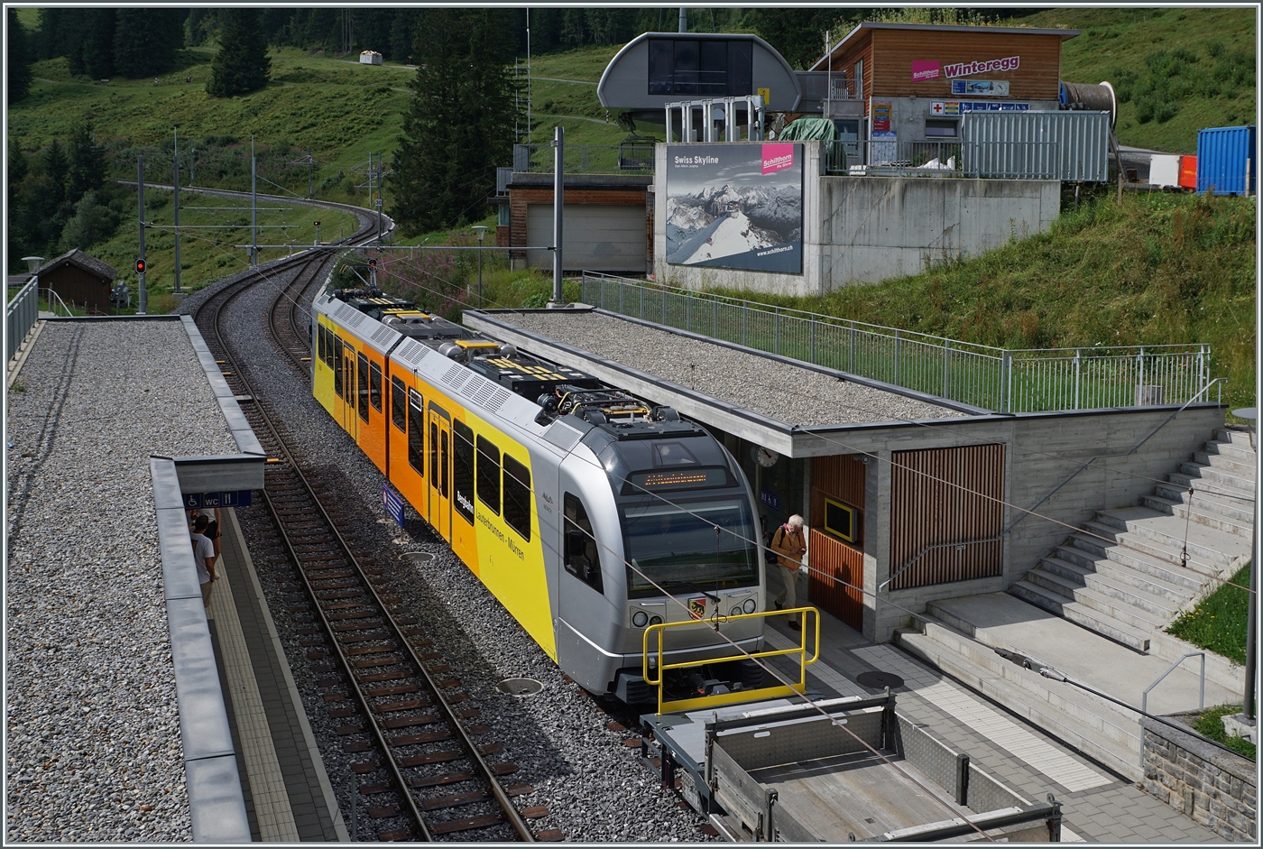 In Winteregg kreuzen sich der neue Be 4/6 101 "Eiger" auf der Fahrt nach Mürren und der Be 4/4 31 "Lisi" unterwegs von Mürren nach der Grütschalp .