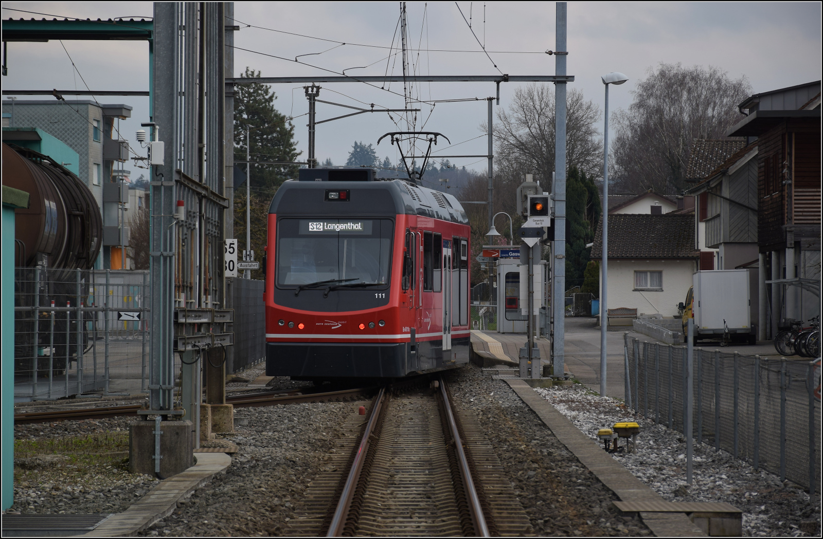 Die frühere Einfachbauweise der Bahnen entlang von Strassen oder gar darauf, sorgt auch über 100 Jahre später für vielfältige Kuriosa. Da ich nicht wusste, welche Route das Bierlisi nehmen würde, habe ich einfach die Verzweigung als ersten Fotohalt genommen. Die spannende Situation mit den vielen wild blinkenden Bahnübergängen wurde mir aber erst bei Annäherung des Zuge bewusst. Diese kurze Strecke bis St. Urban ist halt eher weniger bekannt, und ich hatte sie auch immer ein wenig ignoriert, obwohl ich links hinten im Bild öfter die Normalspur verfolge, während dort ein wenig eintönig immer der Star vorbeifährt.