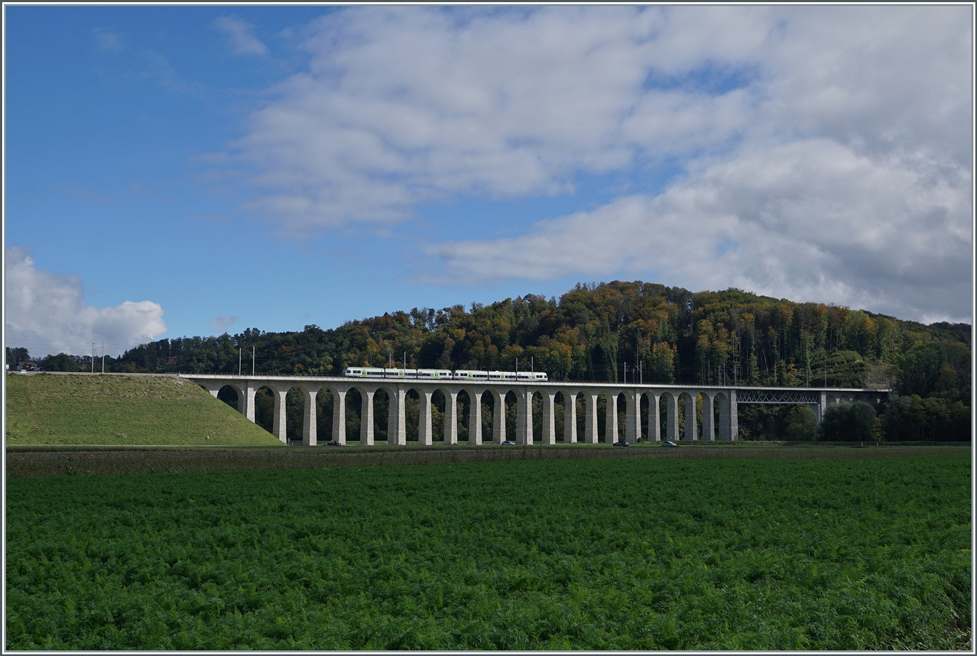 Die ehemalige VHB (Vereinigte Huttwil-Bahnen) / Strecke der ursprünglichen LHB(Langenthal-Huttwil-Bahn) / heute BLS S-Bahn Luzern S6 und S7: Von Lindenholz her gesehen fährt BLS NINA 525 006 Richtung Langanthal; Blick auf Madiswil mit seiner markanten Kirche. 31.Dezember 2021