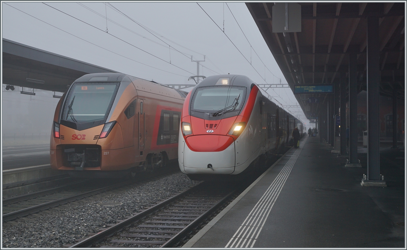 Bahnfotografie im Winterhalbjahr bei  schönem  Hochdruckwetter hat öfters seine Tücken: entweder ist es neblig wie hier, oder das Tal durch welches die Bahn fährt, liegt im Schatten... Im nebligen Arth-Goldau wartet der SOB RABe 526 227 als IR 2010 (Voralpenexpress) auf die Abfahrt nach Luzern und der SBB Giruno RABe 501 022  Waadt / Vaud  als IC 21 10663 auf die Reise über die Gotthard Panorama Strecke nach Lugano.