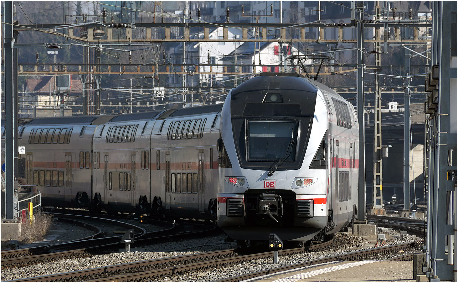 Der Bahnhof Wipkingen: Ein Doppelstock "KISS" IC der DB braust durch Wipkingen nach Zürich, von wo er dann nach Stuttgart zurückfahren wird. 5.März 2025