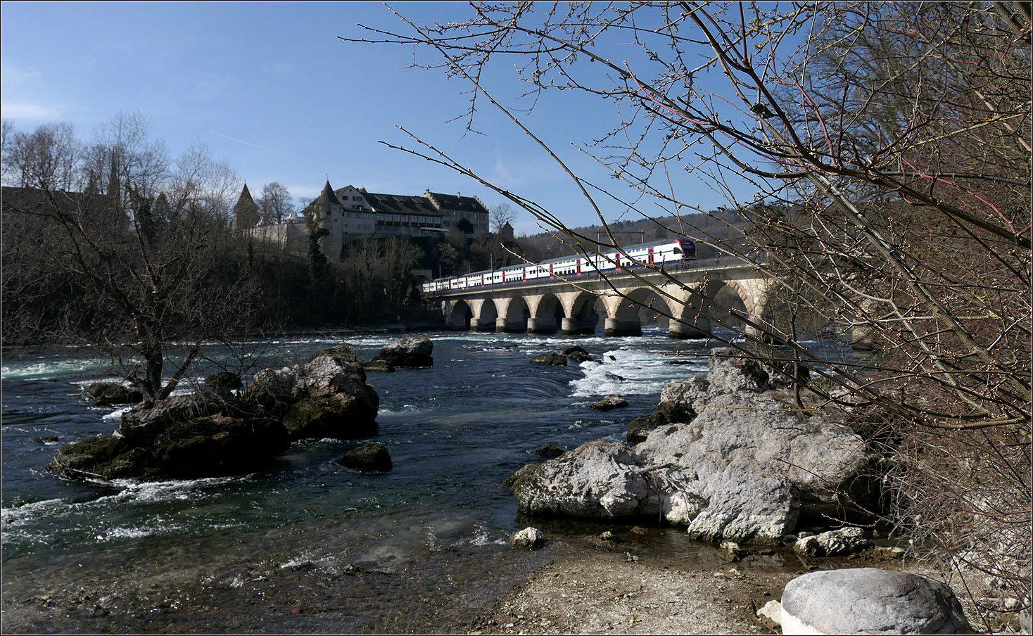 Nach Querung des Rheines oberhalb des Wasserfalls verschwindet 511 043 im nächsten kurzen Tunnel, auf dessen anderen Seite dann bald der Bahnhof Neuhausen erreicht wird.