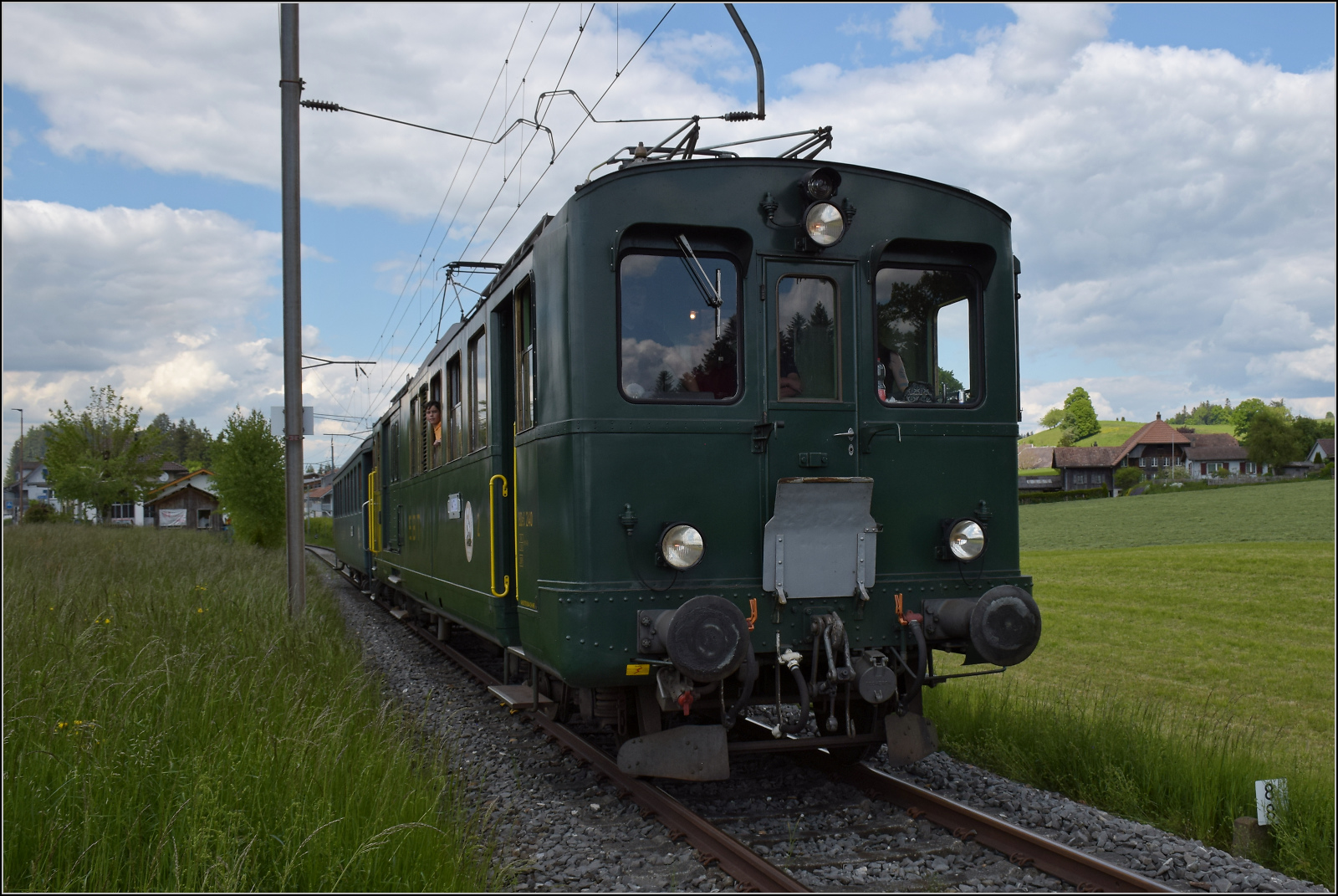 Der Triebwagen BDe 2/4 240 wurde im Jahr 1932 für die Emmentalbahn gebaut und als CFe 2/4 124 bezeichnet. Mit der Fusion zur Emmental-Burgdorf-Thun-Bahn wurde er in CFe 2/4 224 umbezeichnet, entging später dem Umbau zum Gepäcktriebwagen De 4/4 bzw. De 586. Stattdessen fährt er seit 1988 als BDe 2/4 240 auf den RM-Strecken, mittlerweile hat der Triebwagen seine Heimat bei der Historischen Emmentalbahn in Huttwil gefunden. August 2023.