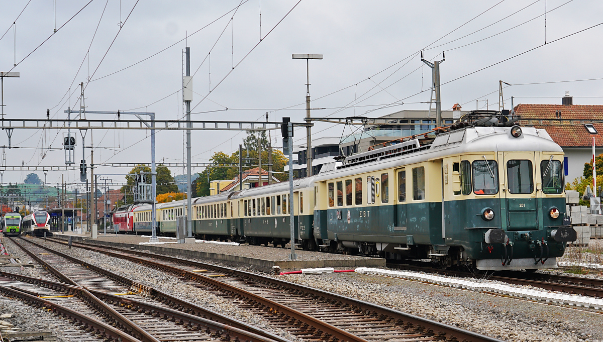 Der BDe 4/4 II 201 "Burgdorf" des Vereins Pendelzug Mirage (VPM) fährt am 11.10.2025 mit dem Bierzug aus dem Bahnhof Murten aus. Am 14.09.1966 wurde er als als BDe 4/4 82 an die Südostbahn geliefert. Diese Sonderfahrt der Bier Arena Murten startete in Murten und führte über Payerne, Yverdon, Neuchatel und Lyss zurück zum Ausgangspunkt.