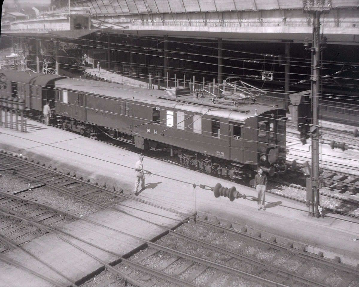 Ausfahrt aus dem alten Bahnhof Bern. Lok "Langnau" der Emmentalbahn. Im Hintergrund De4/5 795 der BLS (damals BN). 6.Juli 1963