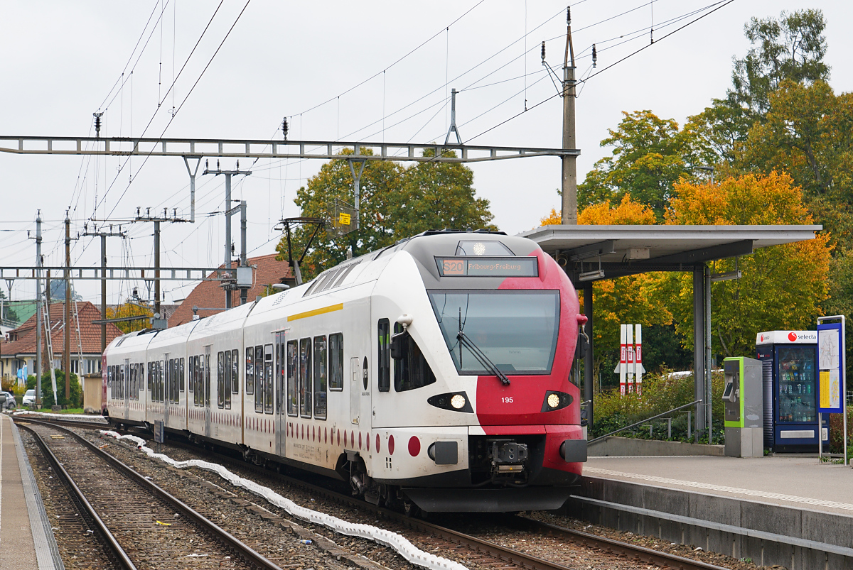 Am 11.10.2025 kommt der TRF-RBDe 527 195 im Bahnhof Murten an