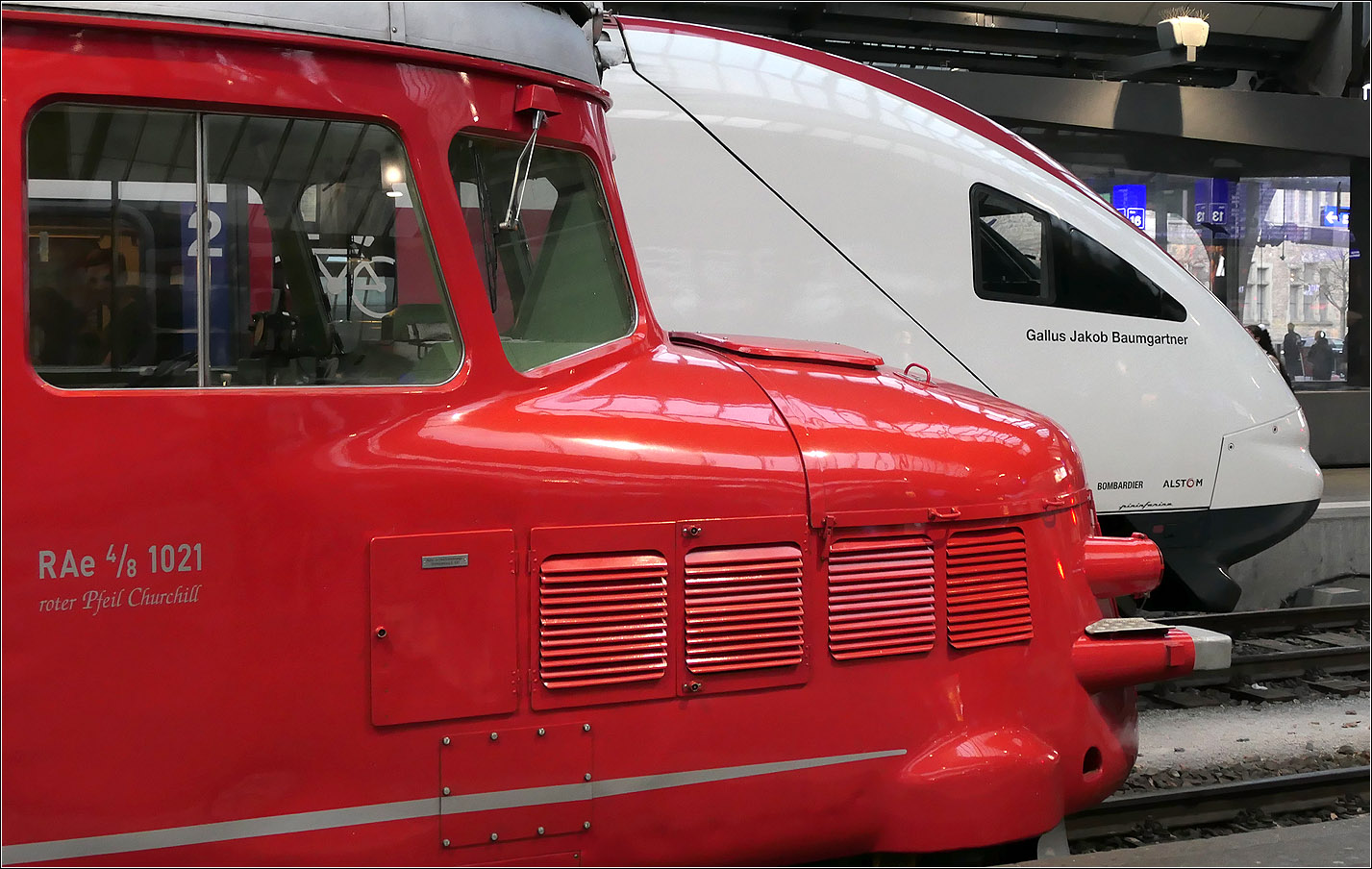 Auch wieder einmal in Lausanne zeigte sich am 12. Mai 2016 der "Rote Pfeil" RAe 4/8 1021 "Churcill-Pfeil".