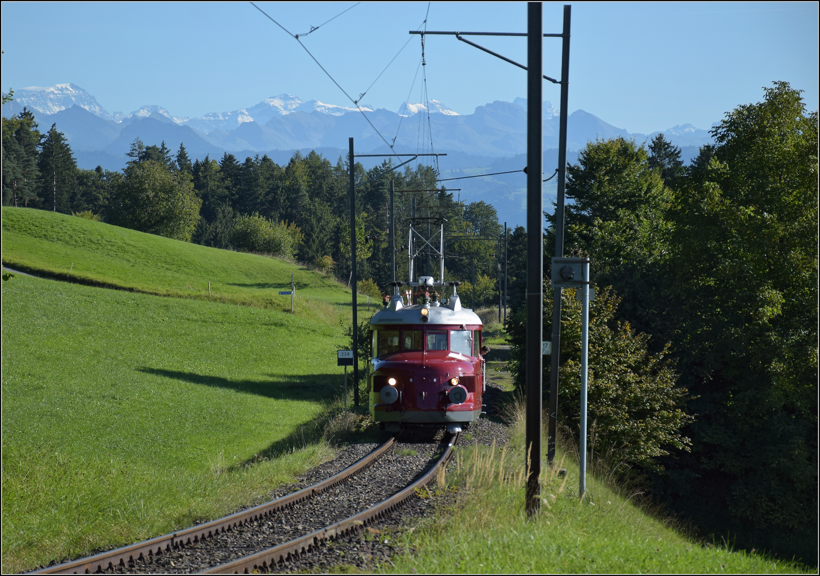 Der Rote Pfeil aus Balsthal durfte beim Jubiläum mitfeiern. Der Aussendienst auf der Kempttalbahn zur Vervollständigung einer Rundfahrt über die Tösstalbahn und Uerikon-Bauma-Bahn zeigt RCe 2/4 607 bei Auslikon nahe dem Päffikersee. Im Hintergrund ist noch hinter dem Baum der Clariden (3267 m), dann sind der Chammliberg (3215 m), in Bildmitte Gross Schärhorn (3292 m)und Chli Schärhorn (3232 m), dann Höch Windgällen (2764 m) und rechts der Gross Ruchen (3137 m) prominent im Bild. September 2025.