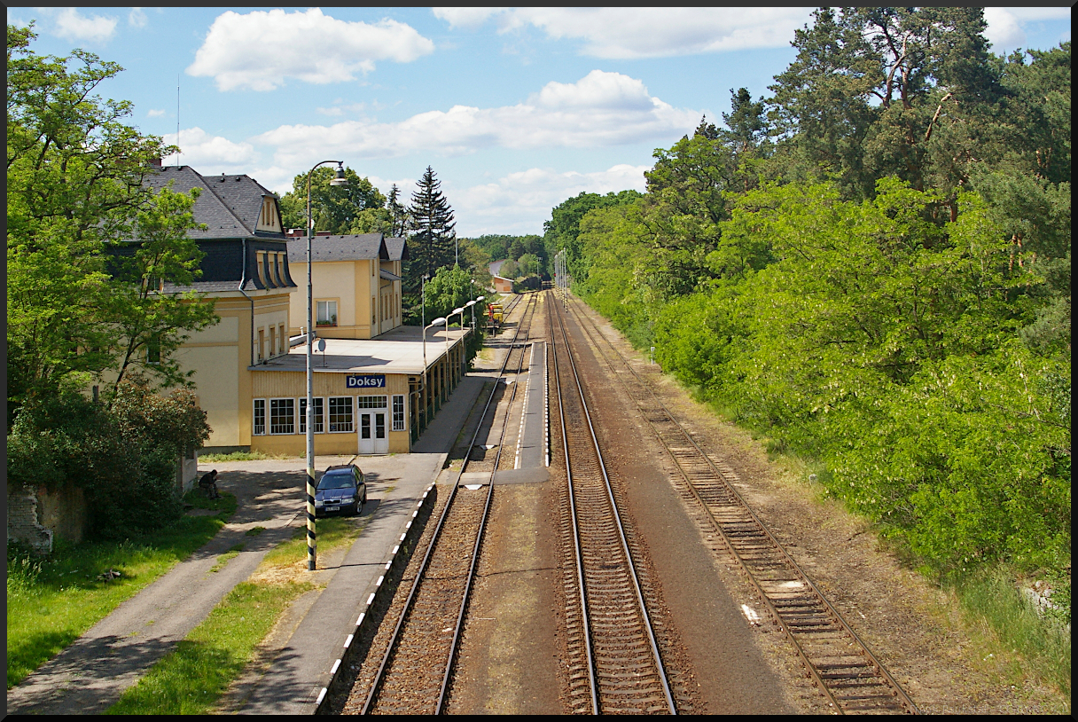 Wenn man den kleinen Bahnhof Doksy so sieht, könnte man meinen irgendwo in einer kleinen Stadt abseits vom regen Leben zu sein. Doch weit gefehlt. So unscheinbar er wirkt, bietet er nur wenige Gehminuten von hier entfernt ein großes Naherhohlungsgebiet mit dem Hirschberger Großteich, der eigendlich ein sehr großer See ist. Nicht weit entfernt liegt die Burg Bezděz, eine gotische Höhenburg. Doksy liegt im Okres Česká Lípa (Böhmisch Leipa), also in Nordböhmen. Die Stadt lebt hauptsächlich vom Tourismus, meistens den Ausflüglern zum Hirschberger Großteich, da dort auch Campingplätze zur Verfügung stehen. Mehr über Doksy: https://www.mesto-doksy.cz Das Foto vom Bahnhof wurde von einer Fußgängerbrücke über die Gleise am 22.05.2022 gemacht.
