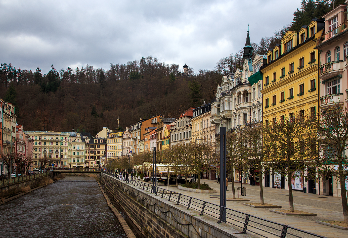 Karlsbad (Karlovy Vary) am 18.04.2023, der Blick vom Spa 5 über den davor befindlichen Park in Richtung Zentrum.