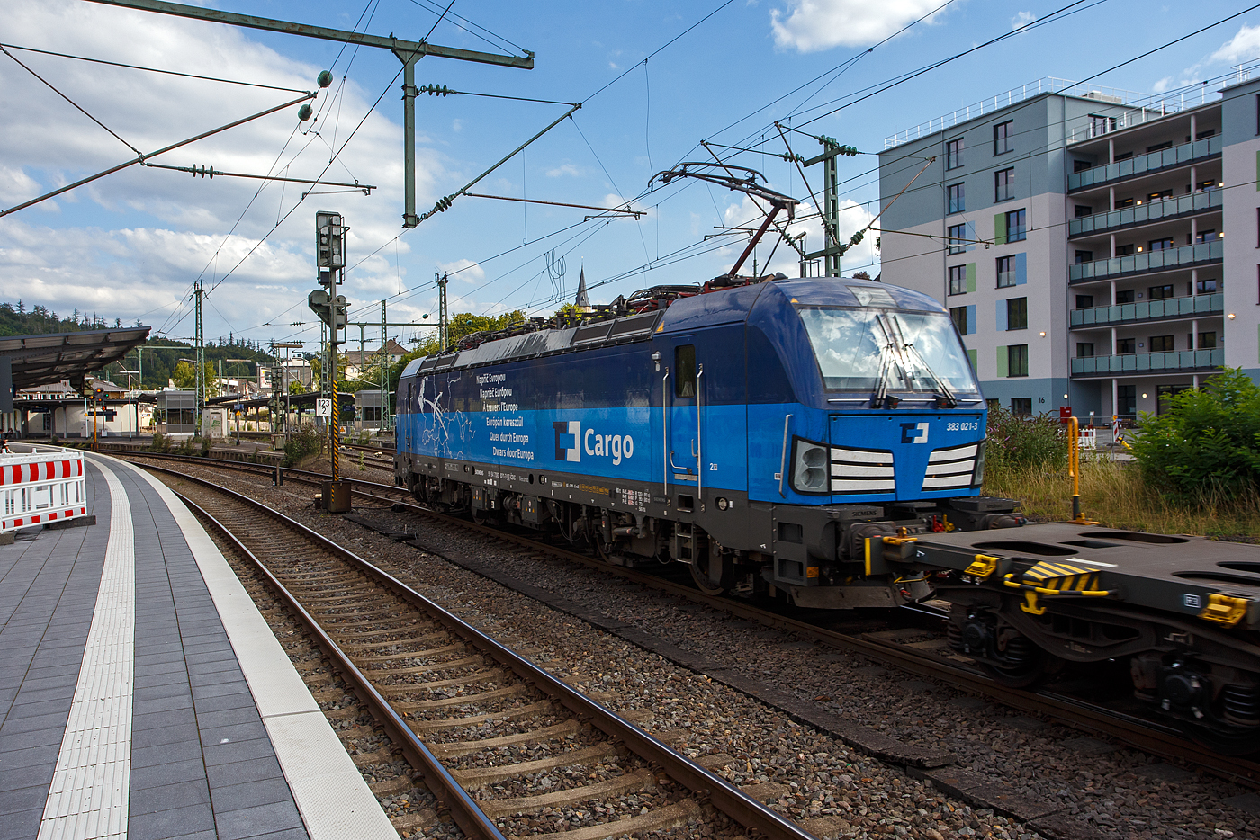 Die 383 021-3 „Napříč Evropou/Quer durch Europa“ (91 54 7383 021-3 CZ-CDC) der ČD Cargo a.s. (Praha/Prag) fährt am 21 August 2025, mit einem leeren Containertragwagenzug, durch Betzdorf/Sieg in Richtung Siegen.